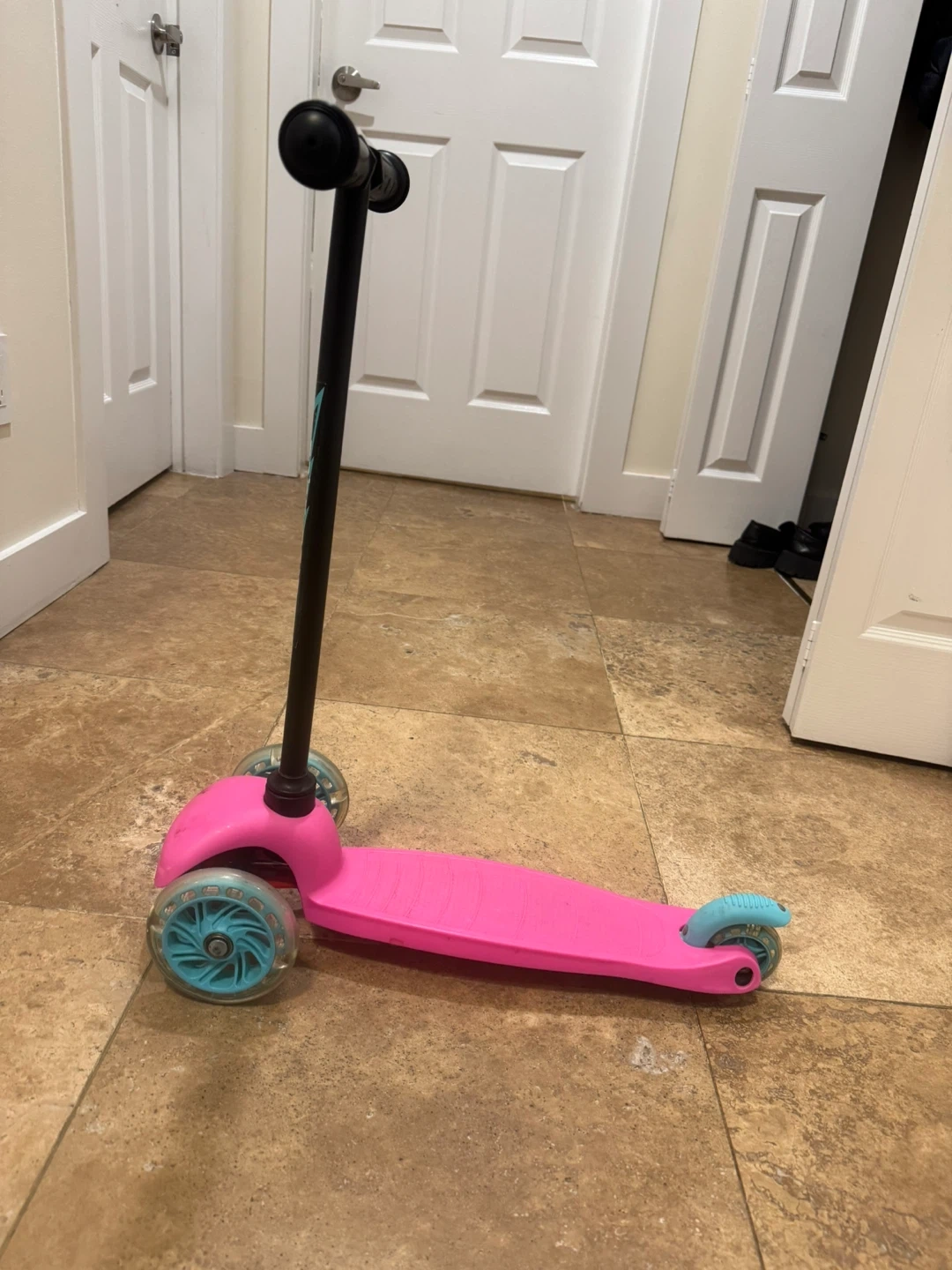 Bright pink 3-wheel scooter for kids. Features a Neon Bolt design on the handlebar. It's built for stability and fun outdoor play.