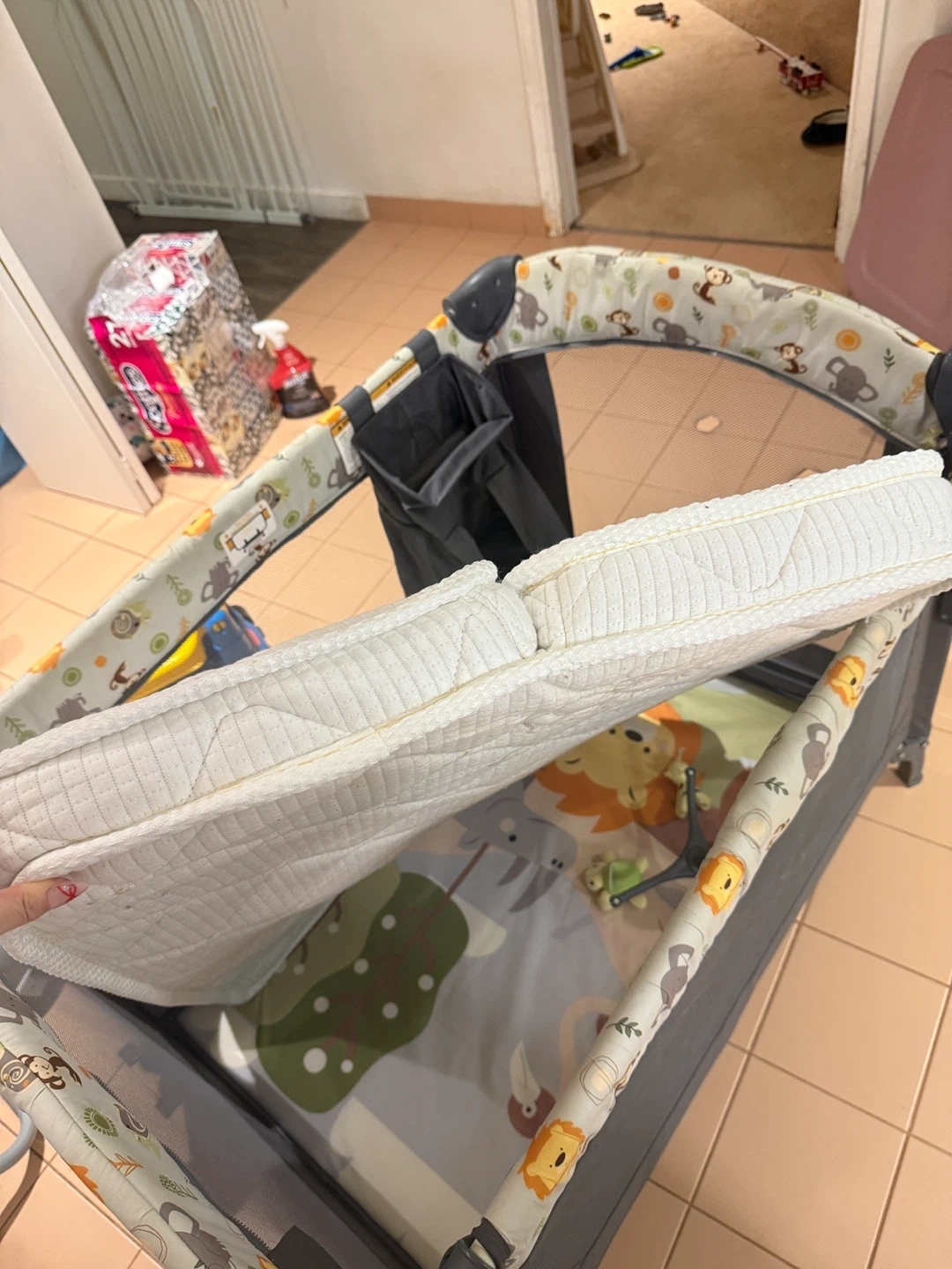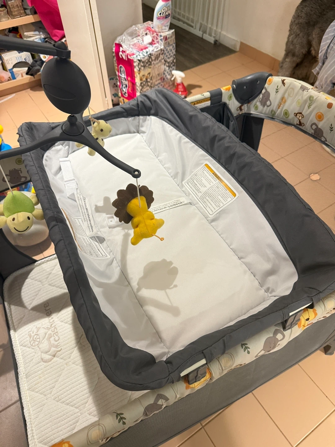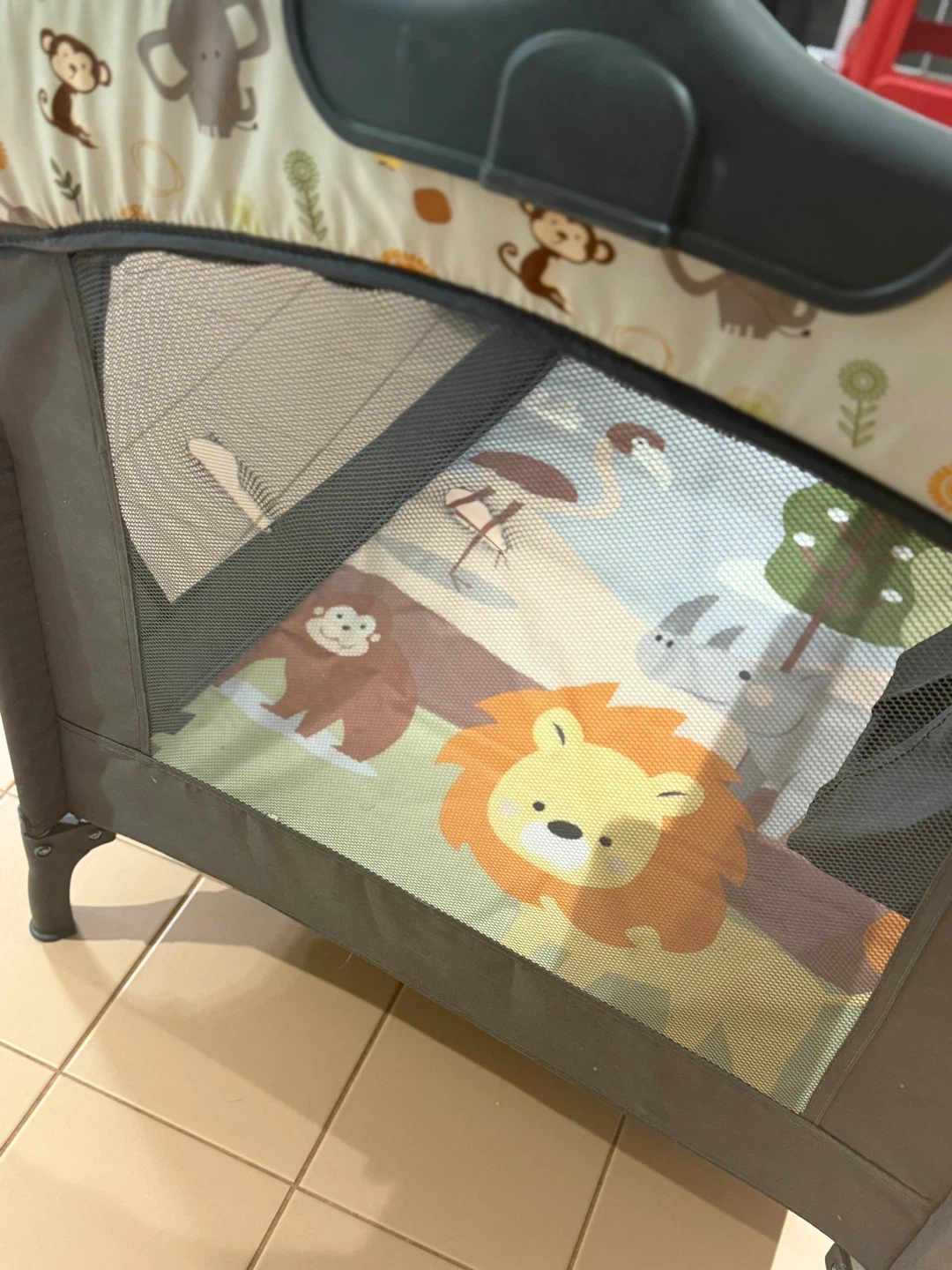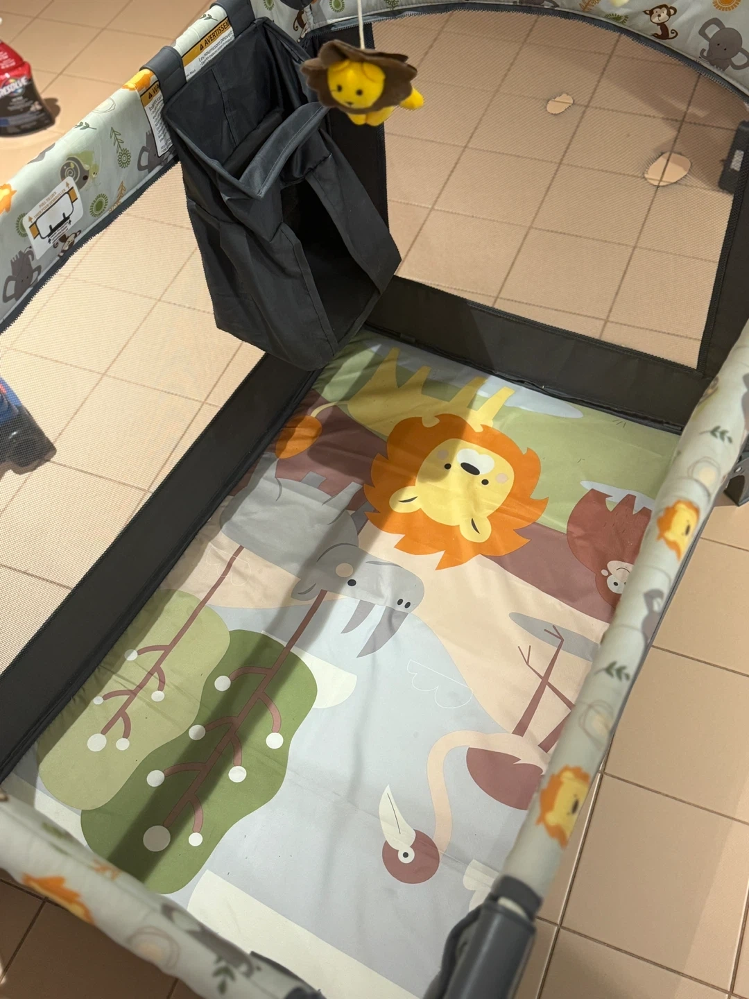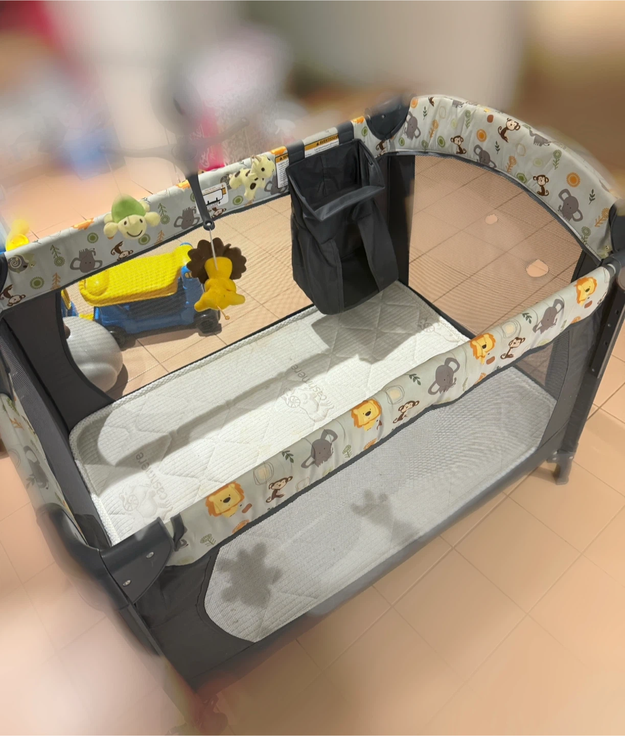 This is a versatile baby crib and bassinet combo. It features a playful jungle animal print on the lining. The mattress is included, and it has a convenient storage pouch attached. It's suitable for newborns and infants.