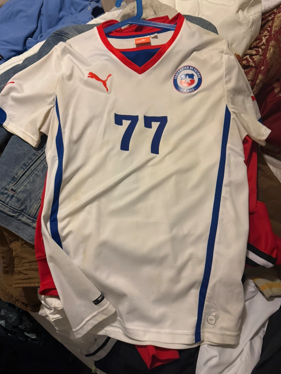 White Puma soccer jersey for the Chile National Team. Features the number 77 on the front and back. Made with breathable, moisture-wicking fabric. Great for cheering on La Roja!