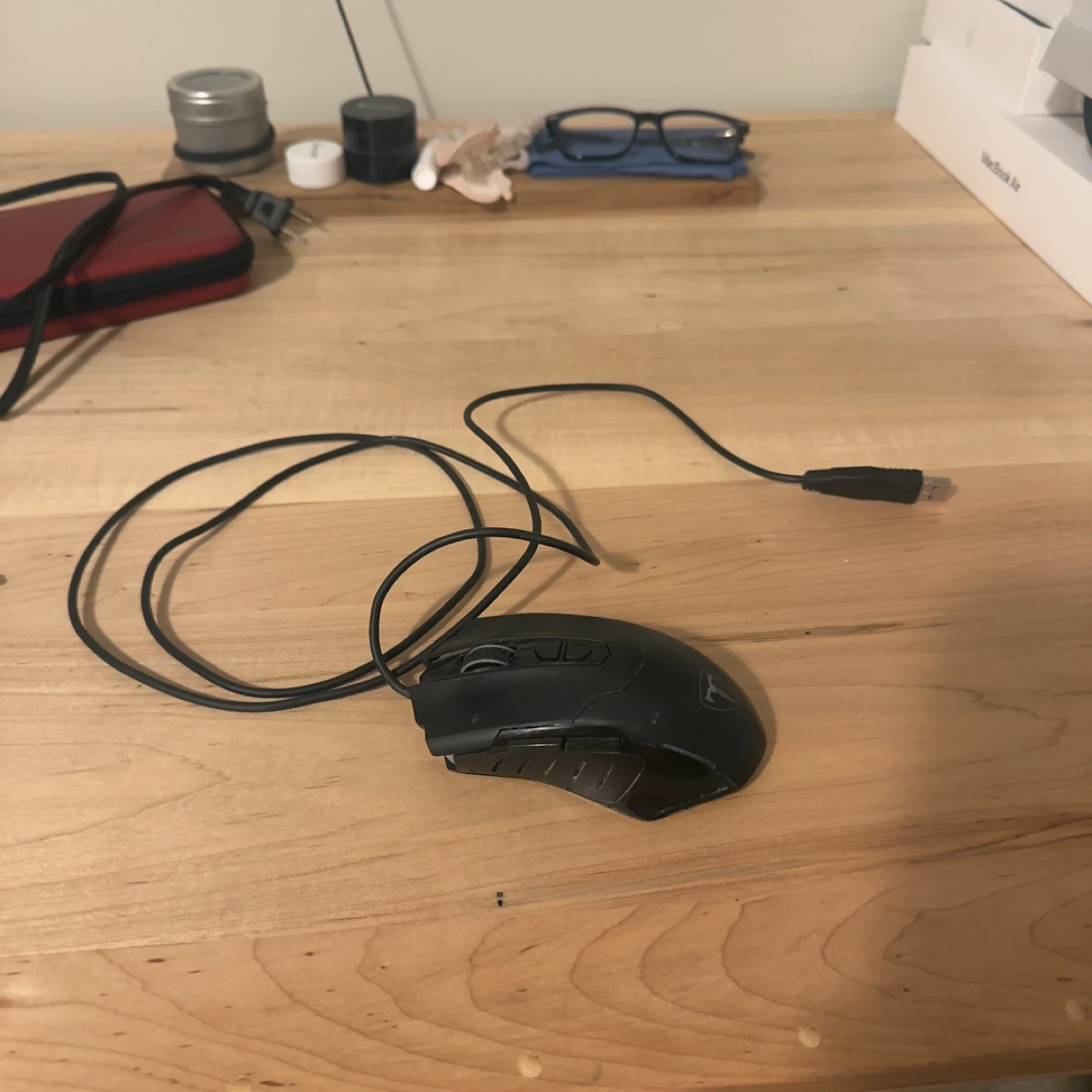 This is a black wired gaming mouse. It features additional buttons on the side for custom commands. Its ergonomic design is made for comfort during long gaming sessions.