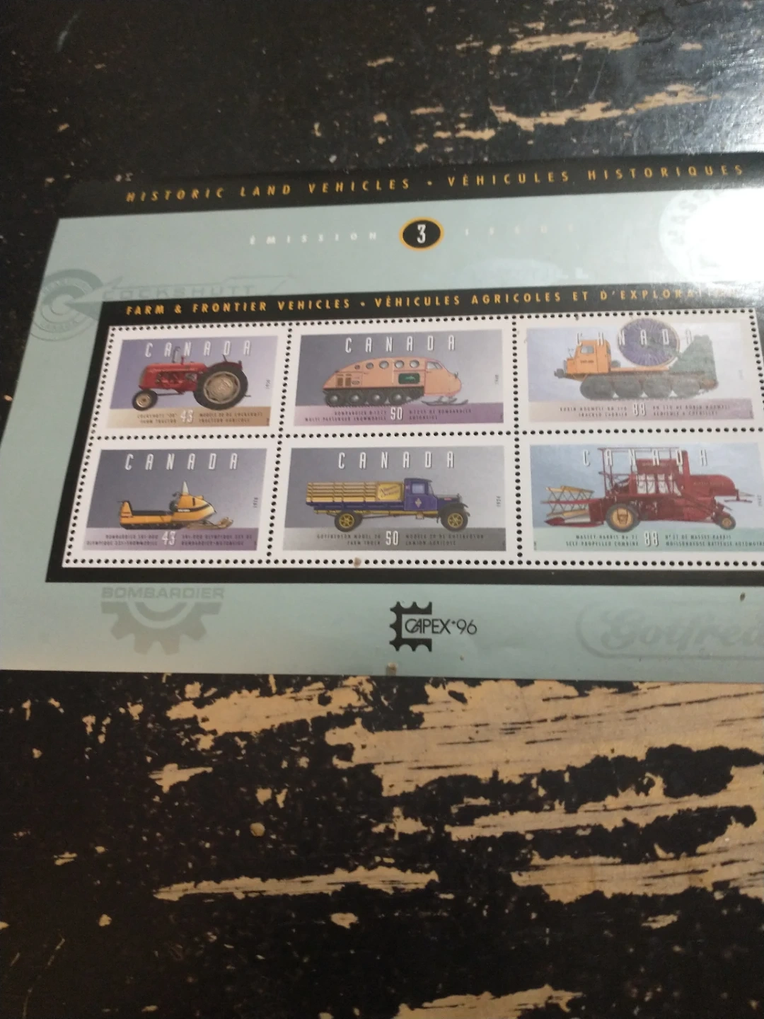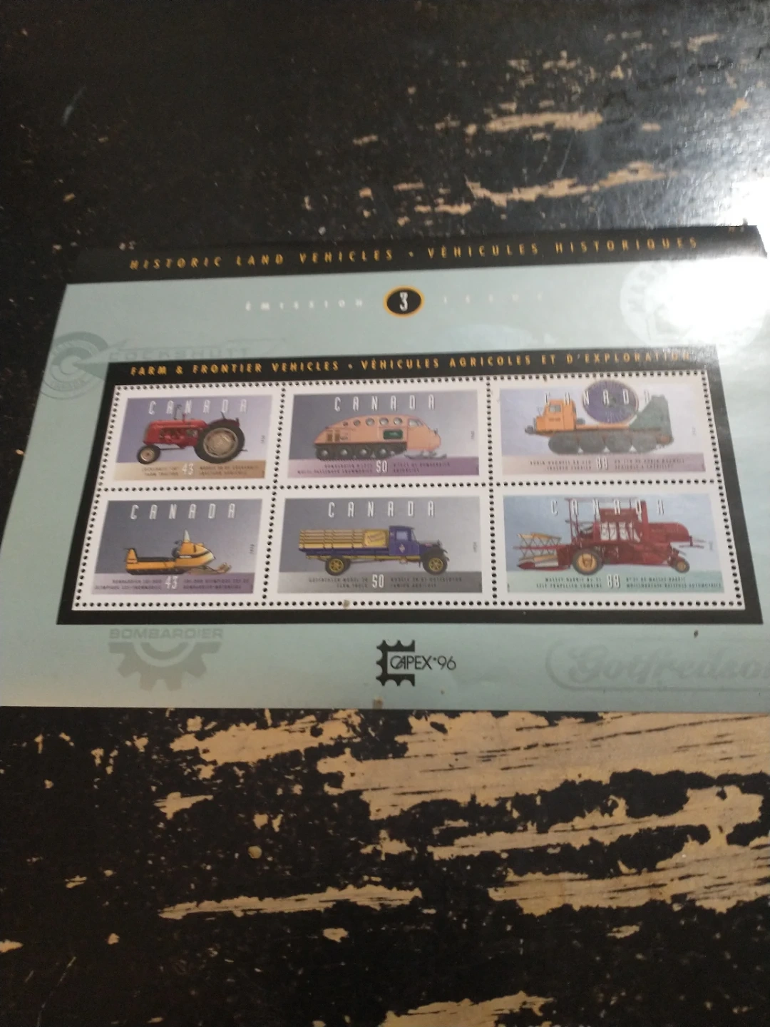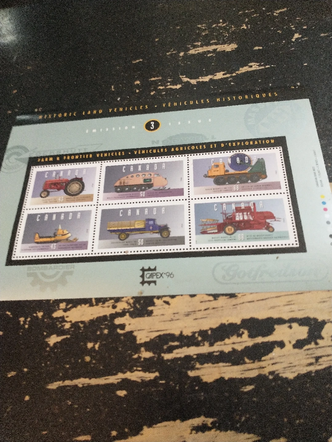 In envelope 11. This is a stamp sheet featuring historic Canadian farm & frontier vehicles. It includes images of a tractor, snow vehicle, and trucks. The sheet is from CAPEX '96. It's a great collectible for history buffs!