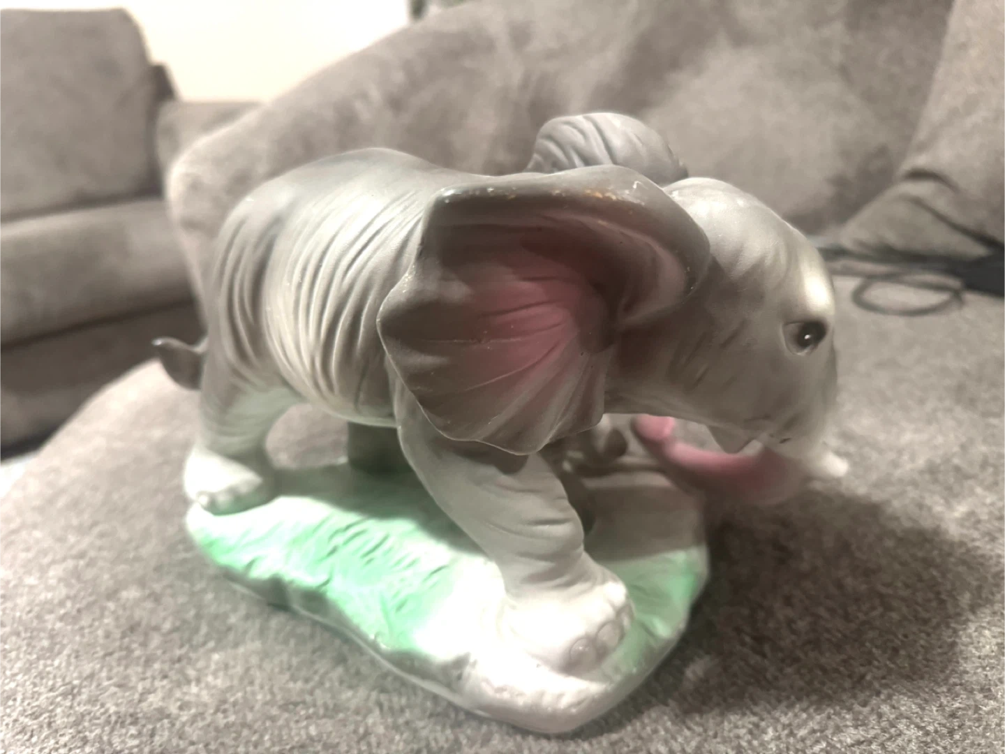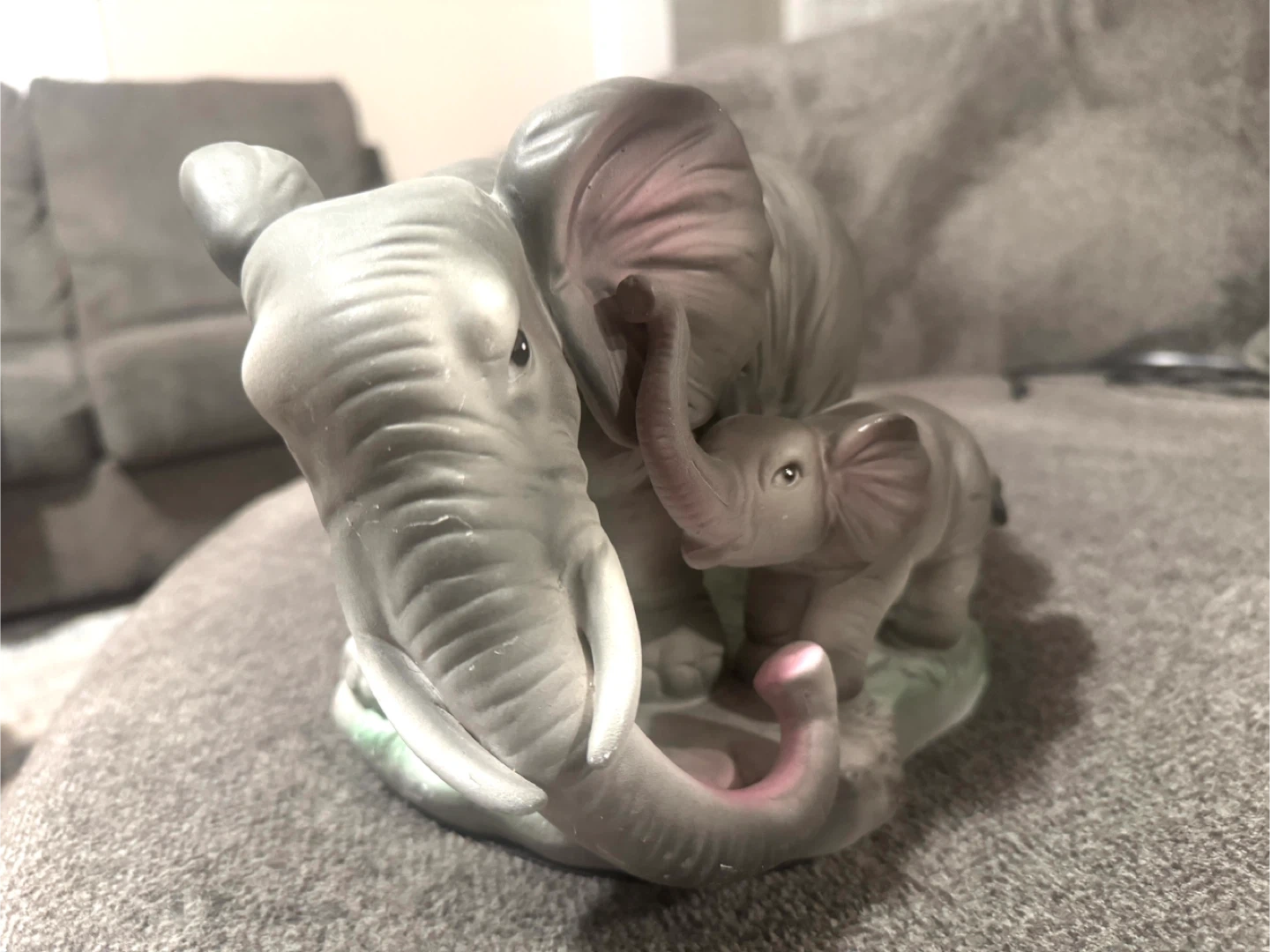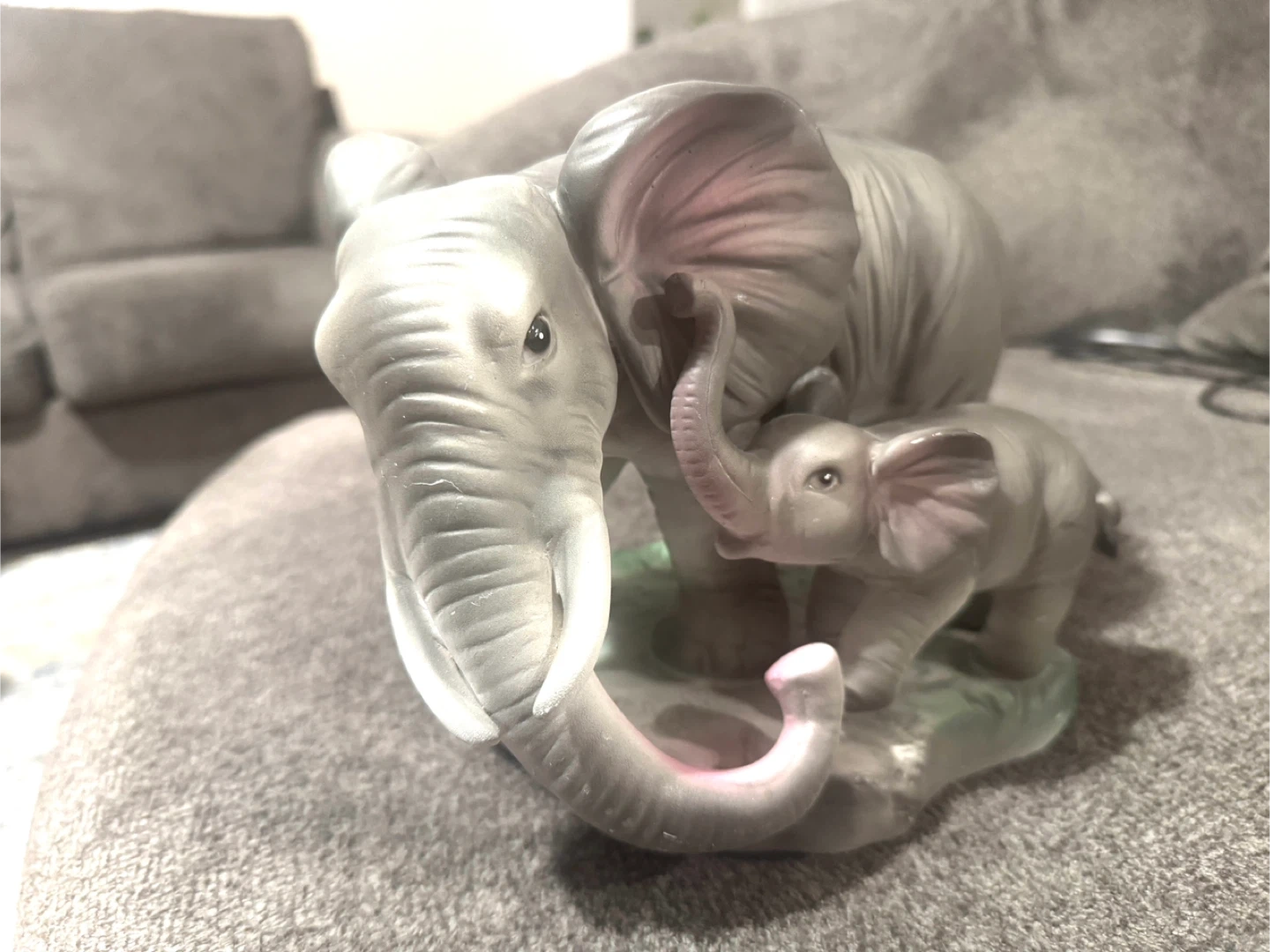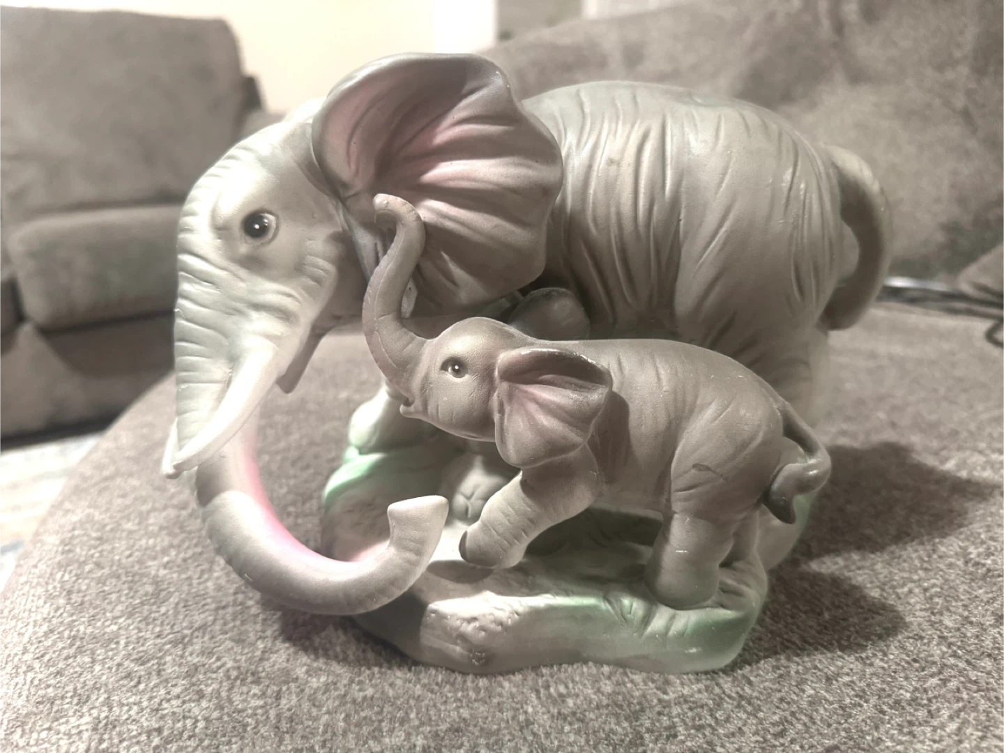 It's a ceramic figurine featuring a mother elephant and calf. The elephants are grey with pink accents inside their ears and trunks. This decorative piece would suit an elephant lover's collection.
