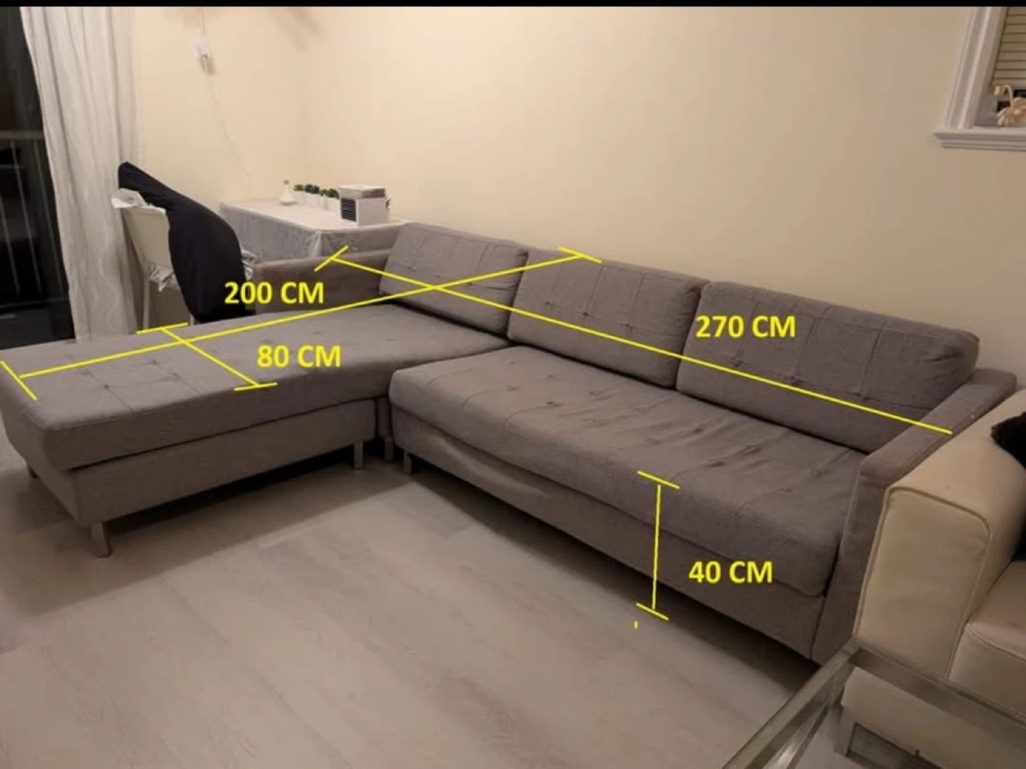 Grey fabric sectional sofa with a chaise lounge. The main sofa section is 270cm long, and the chaise measures 200cm from the corner. Seat height is 40cm.