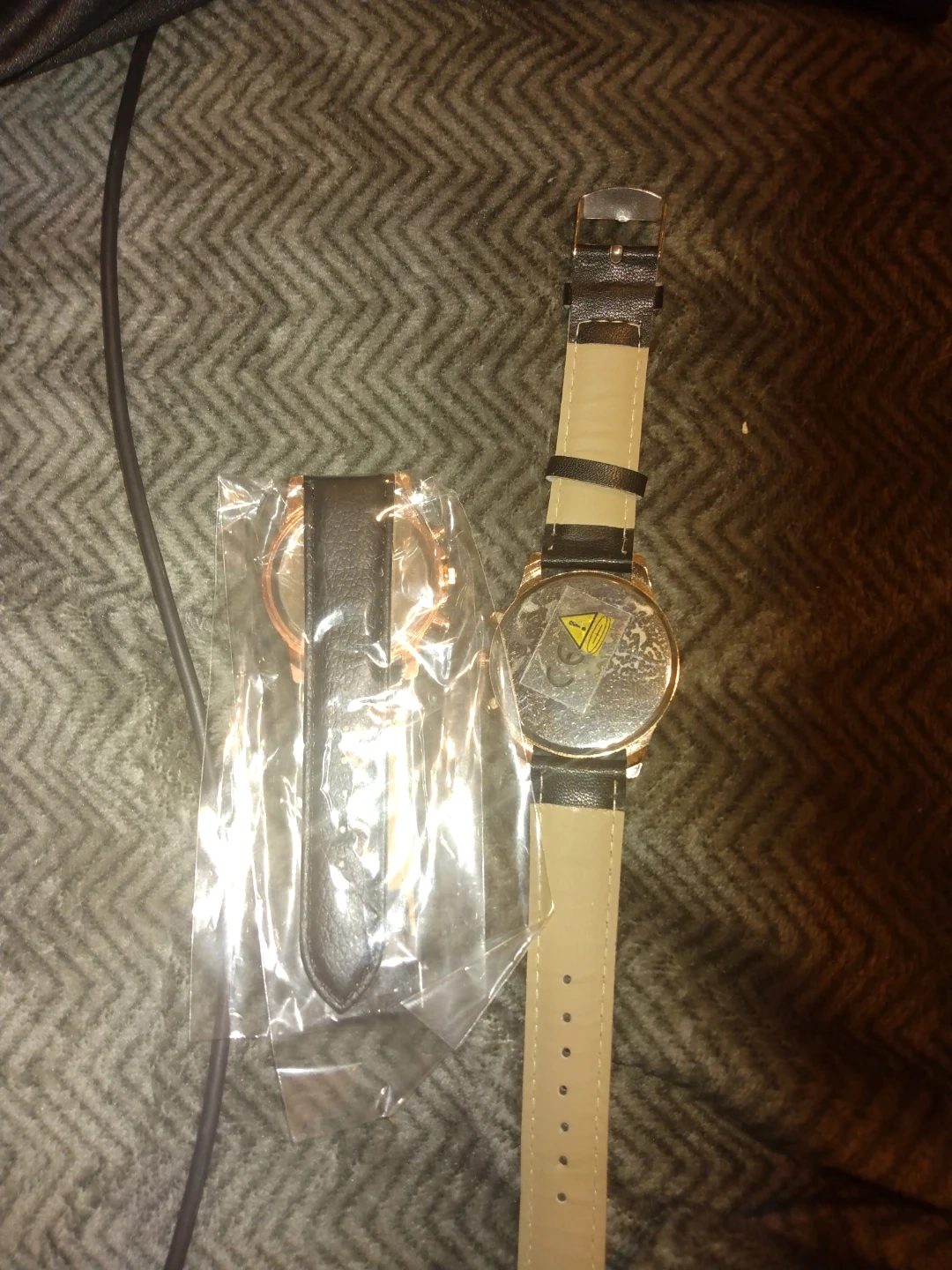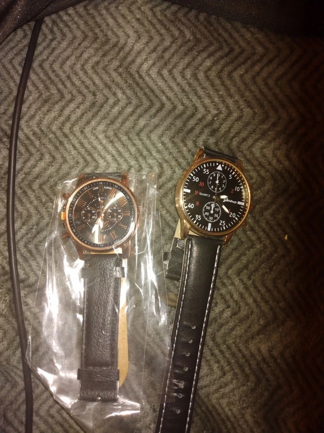 Two stylish Geneva quartz wristwatches. One is new in packaging and the other has a black leather strap with white stitching. Both feature black faces with rose gold-toned cases. A great pair for everyday wear!