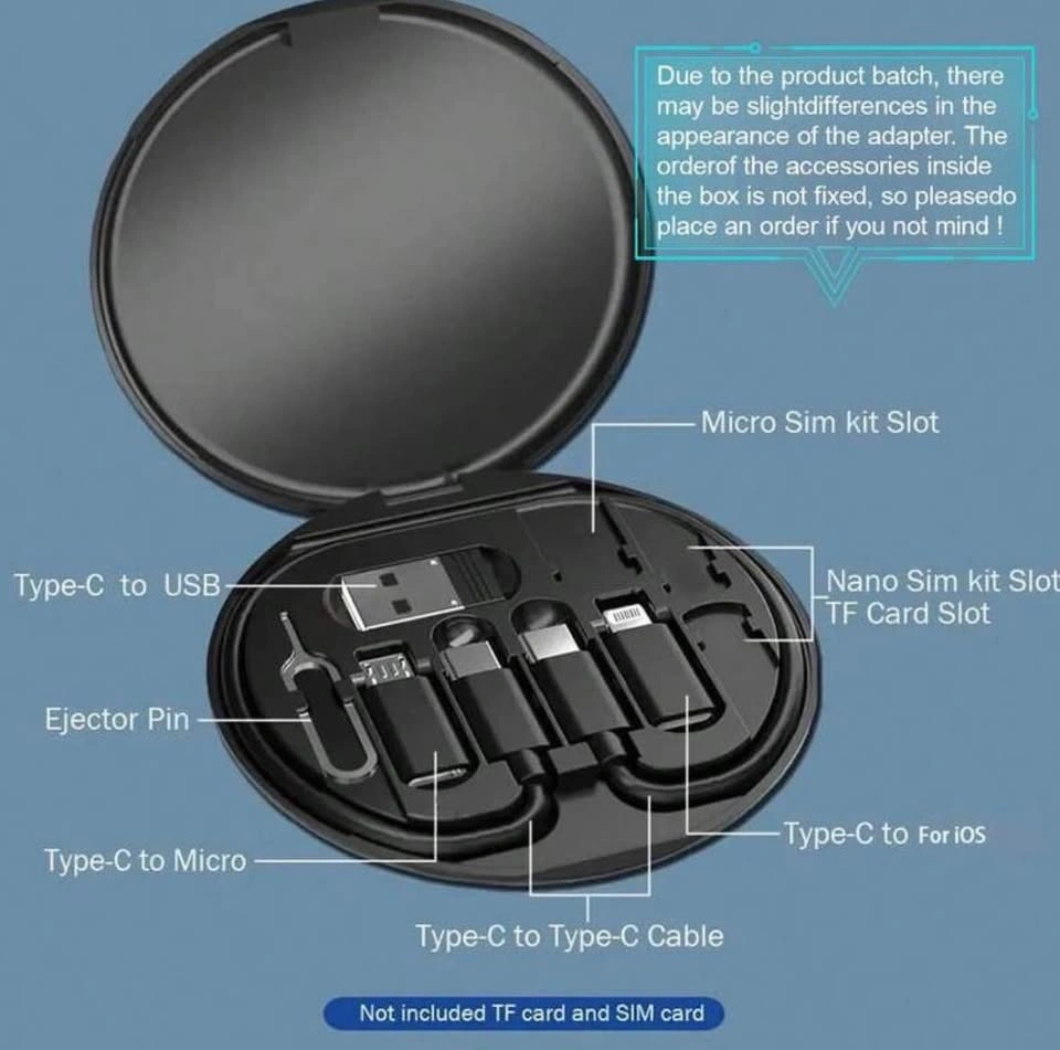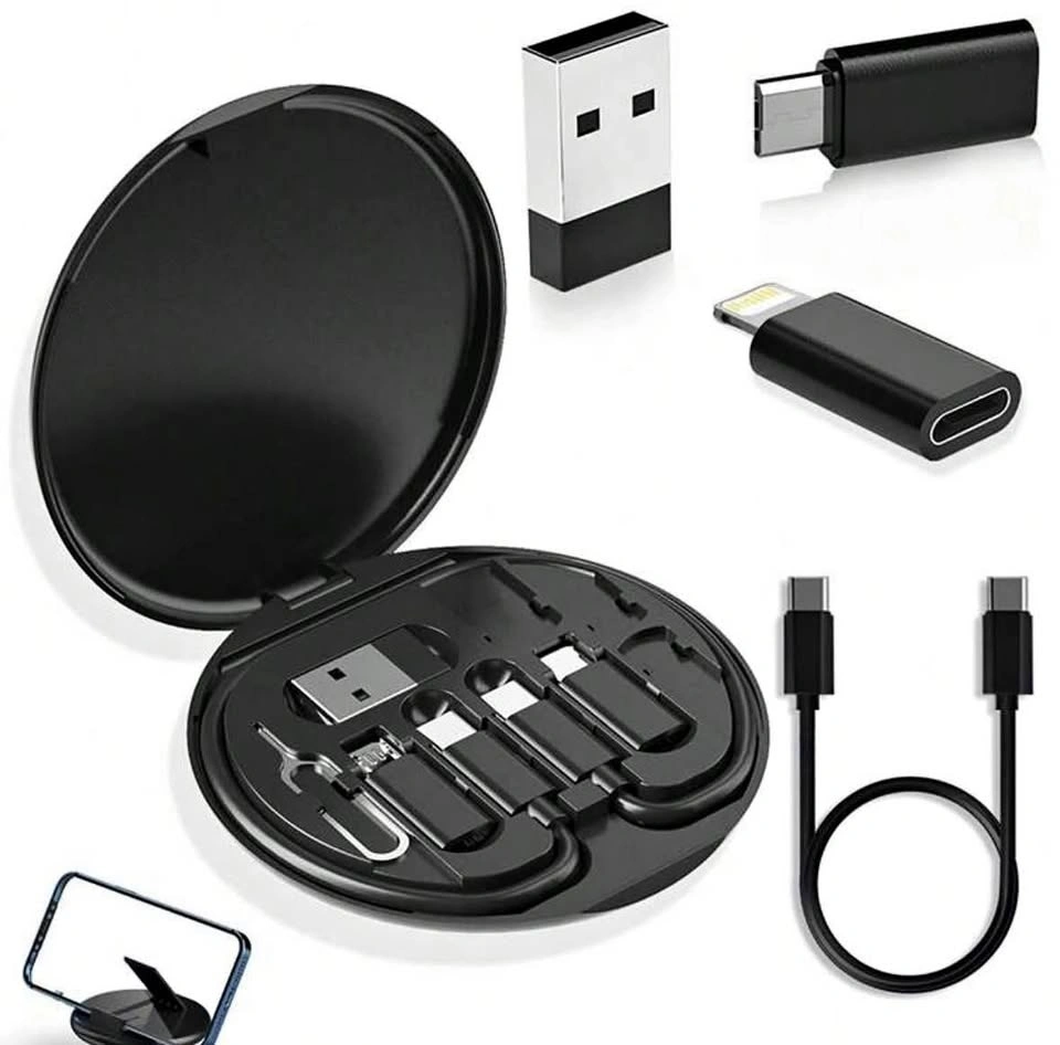 5-in-1 Mini USB Adapter Kit with multi charging cables, in a cable storage box. Includes 60W fast charging USB cable set, silicone Type-C adapter, and card slot for data transmission. Also features a storage card, tray pop-up screw, and a phone holder stand.