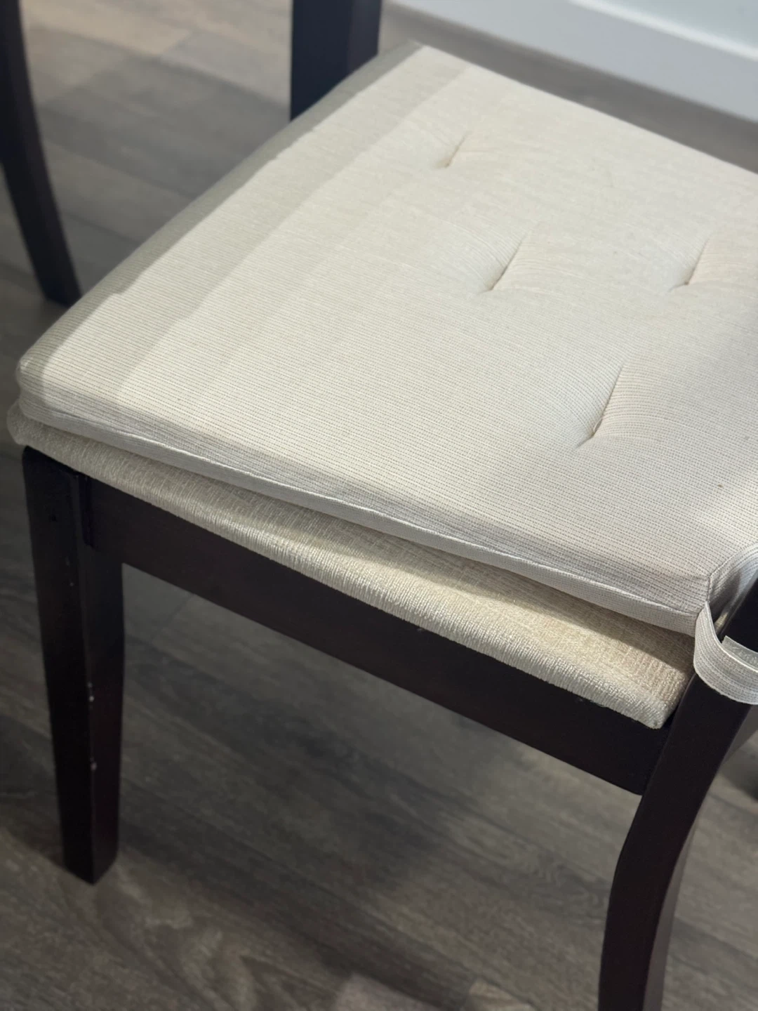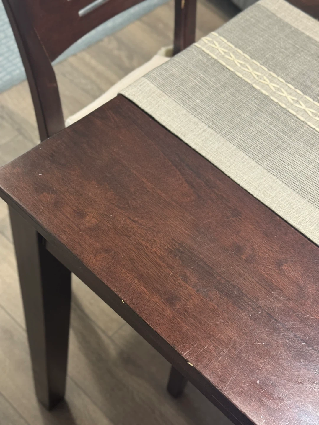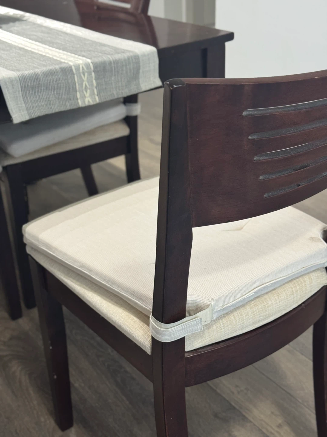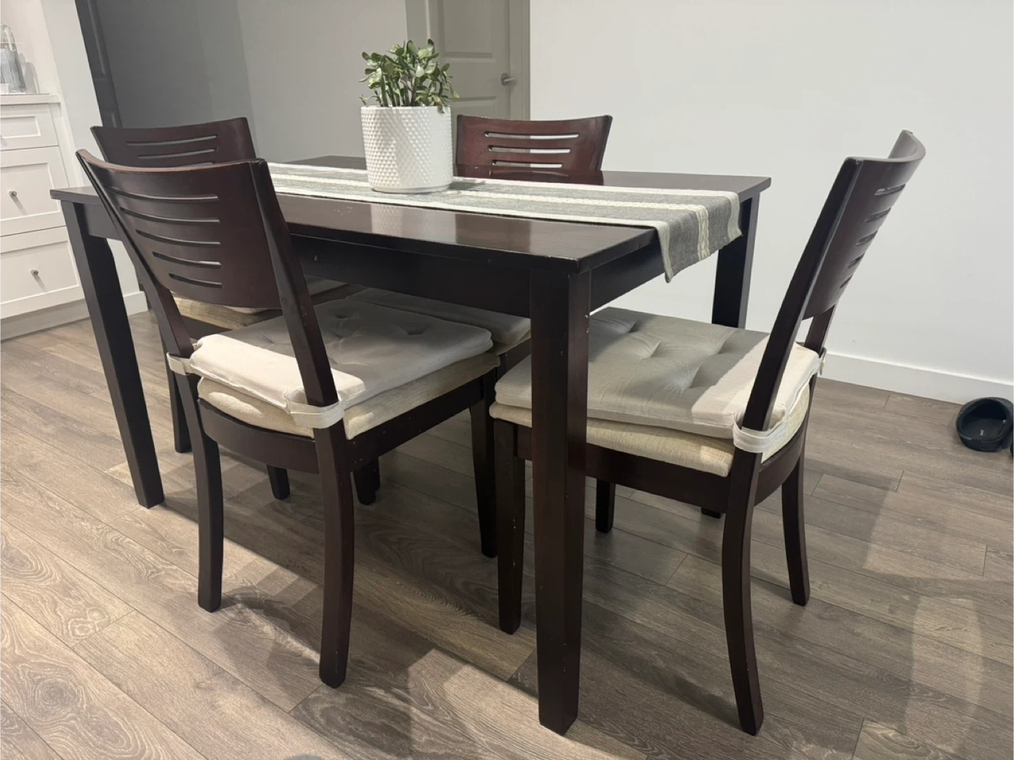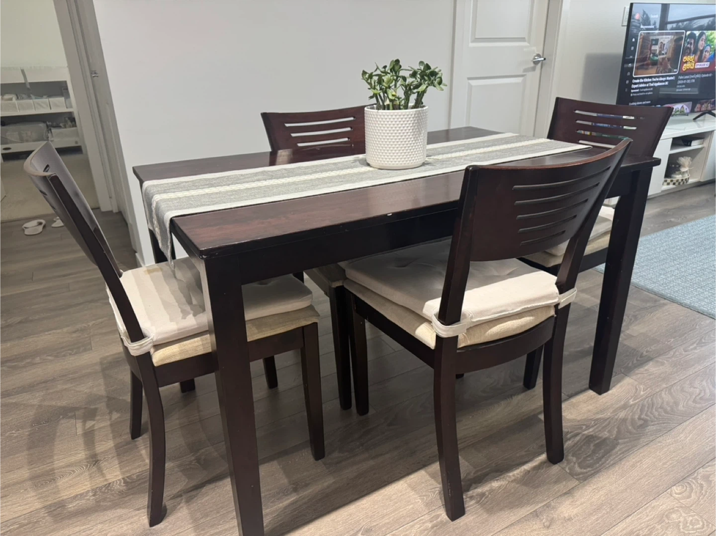 Selling a solid dining table set that includes 1 table and 4 chairs, along with the seat cushions shown in the photos.