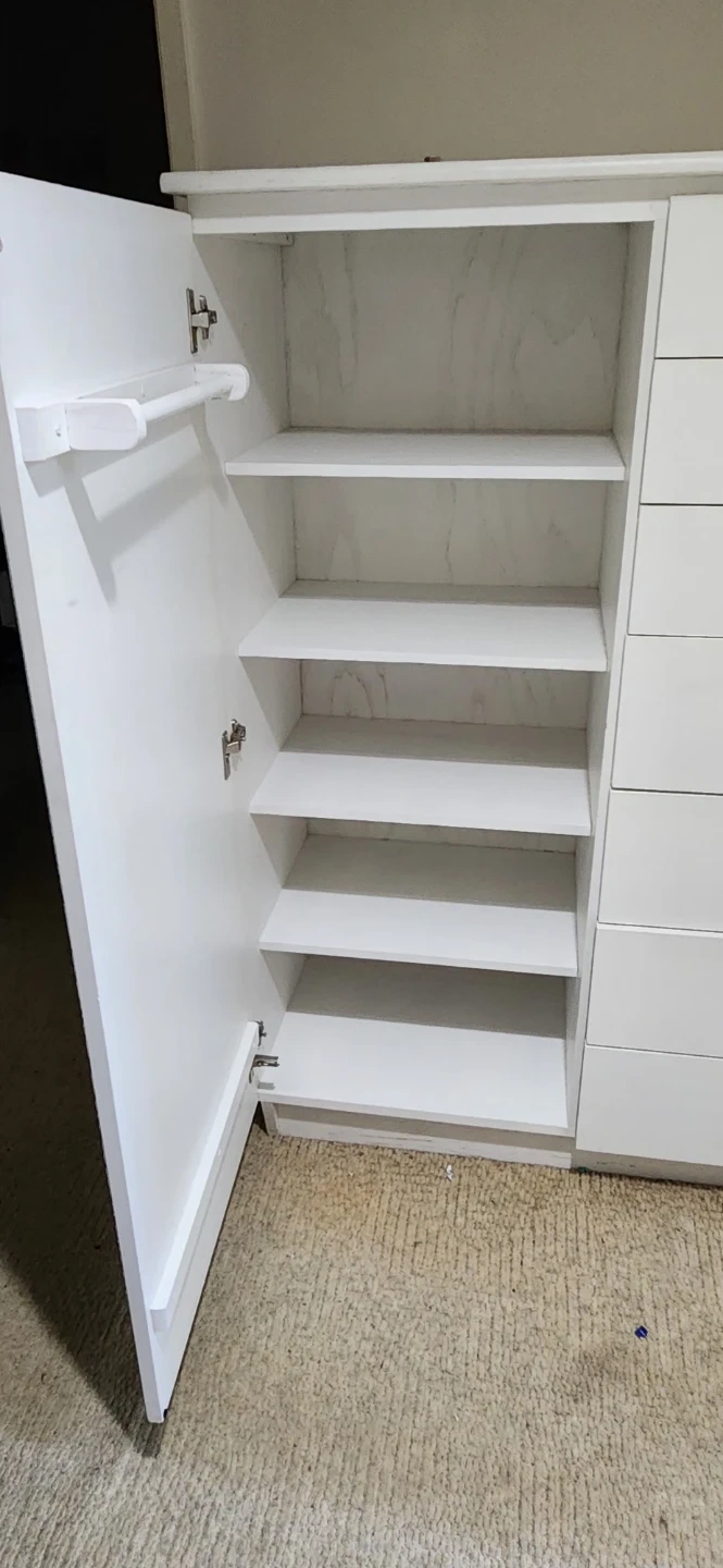 This is a white wardrobe with a hanging rail and five shelves on one side. It also has seven drawers on the other side for storage. The interior of the drawers is wood-grain finish.
