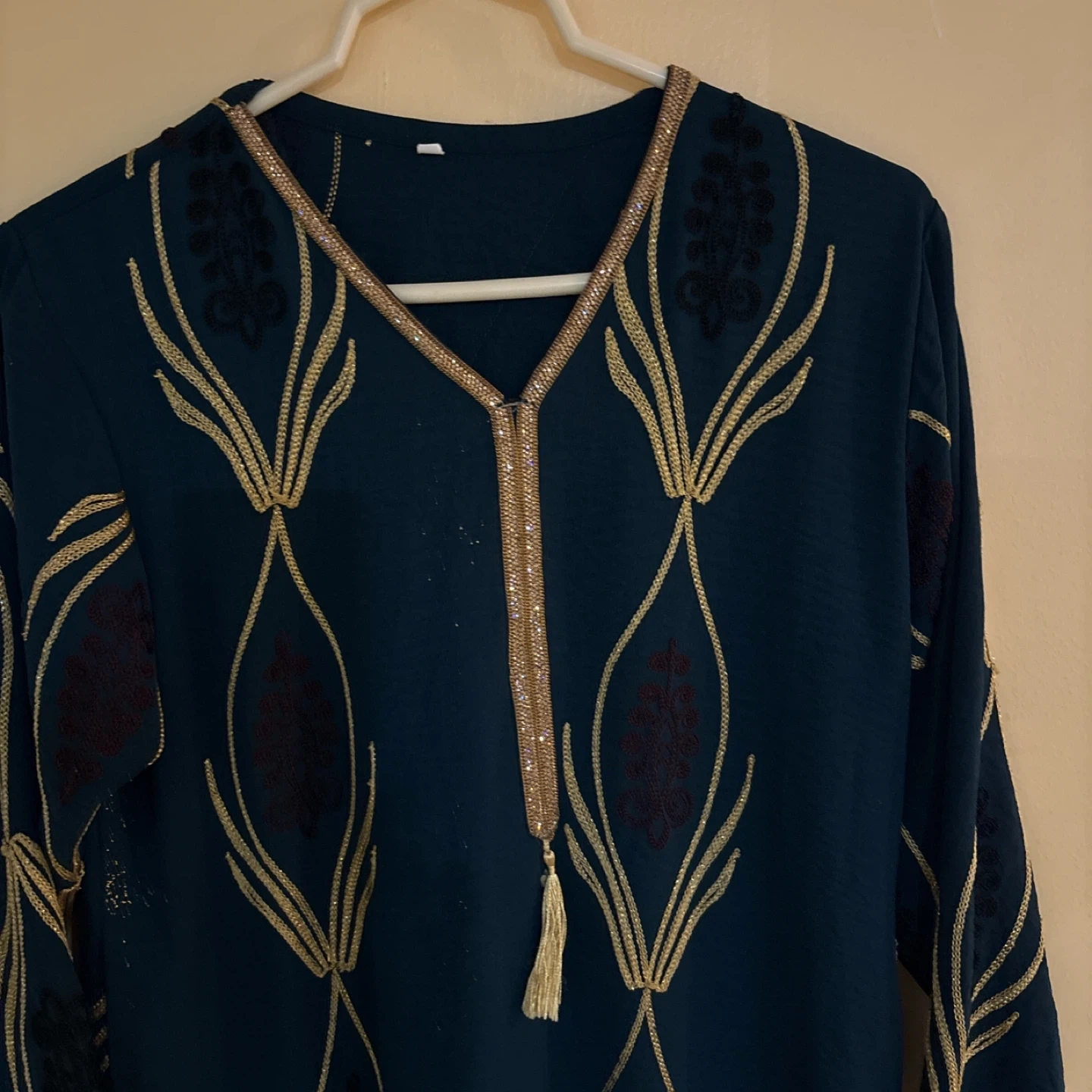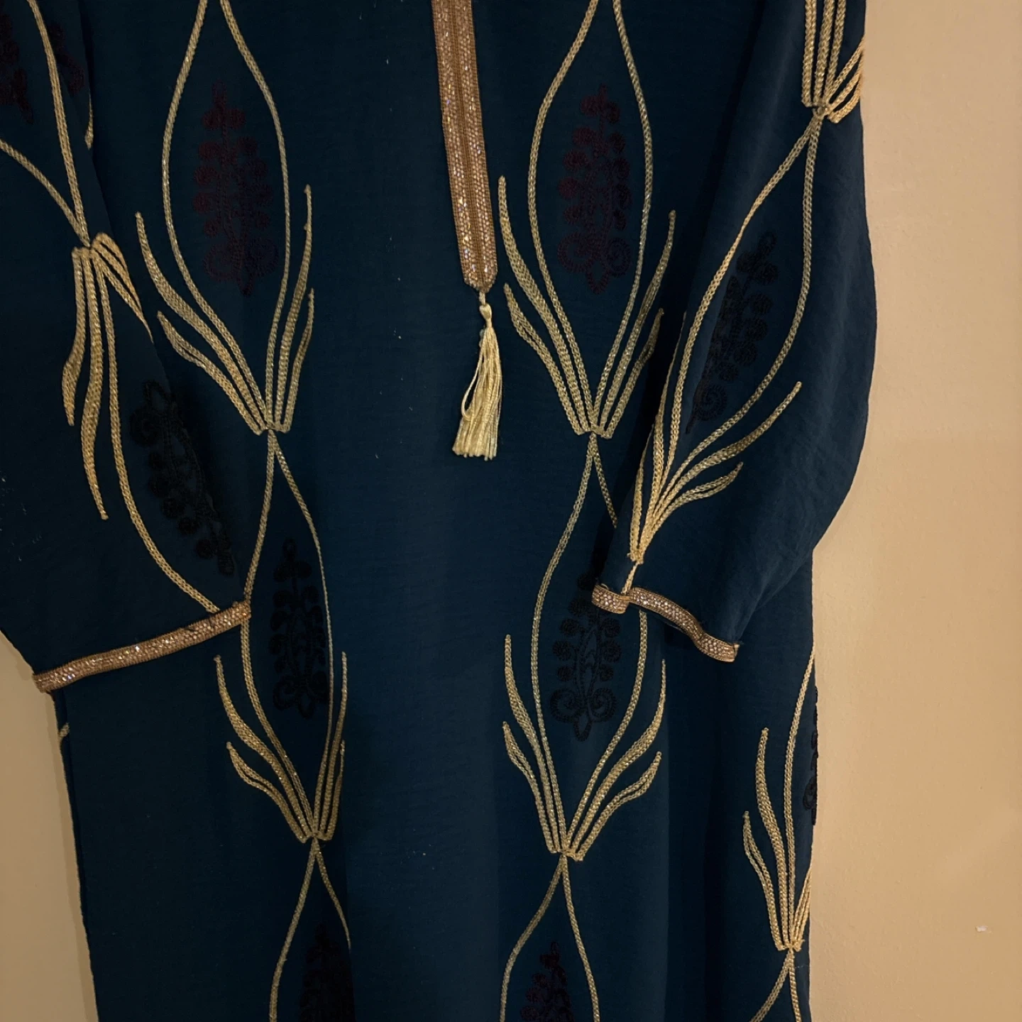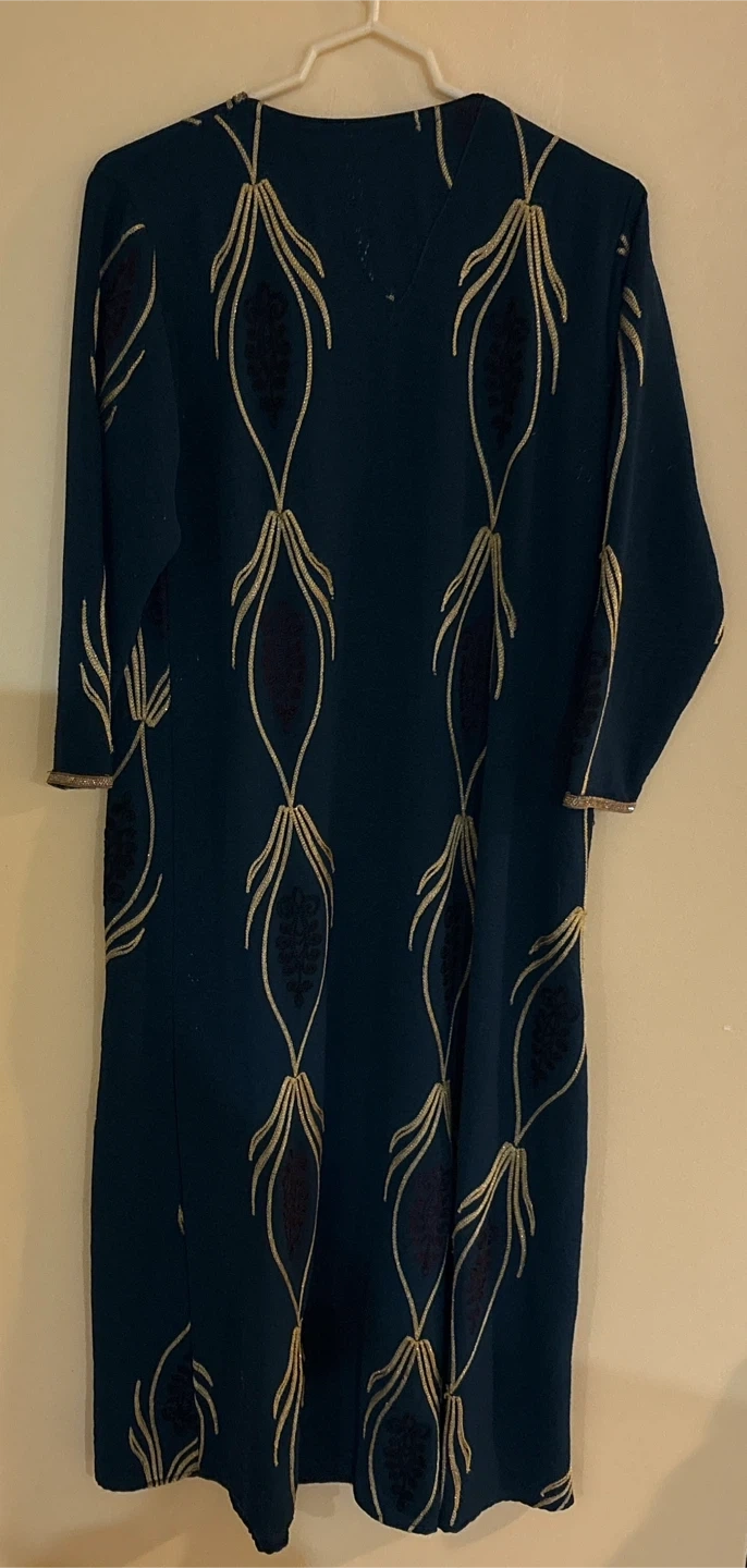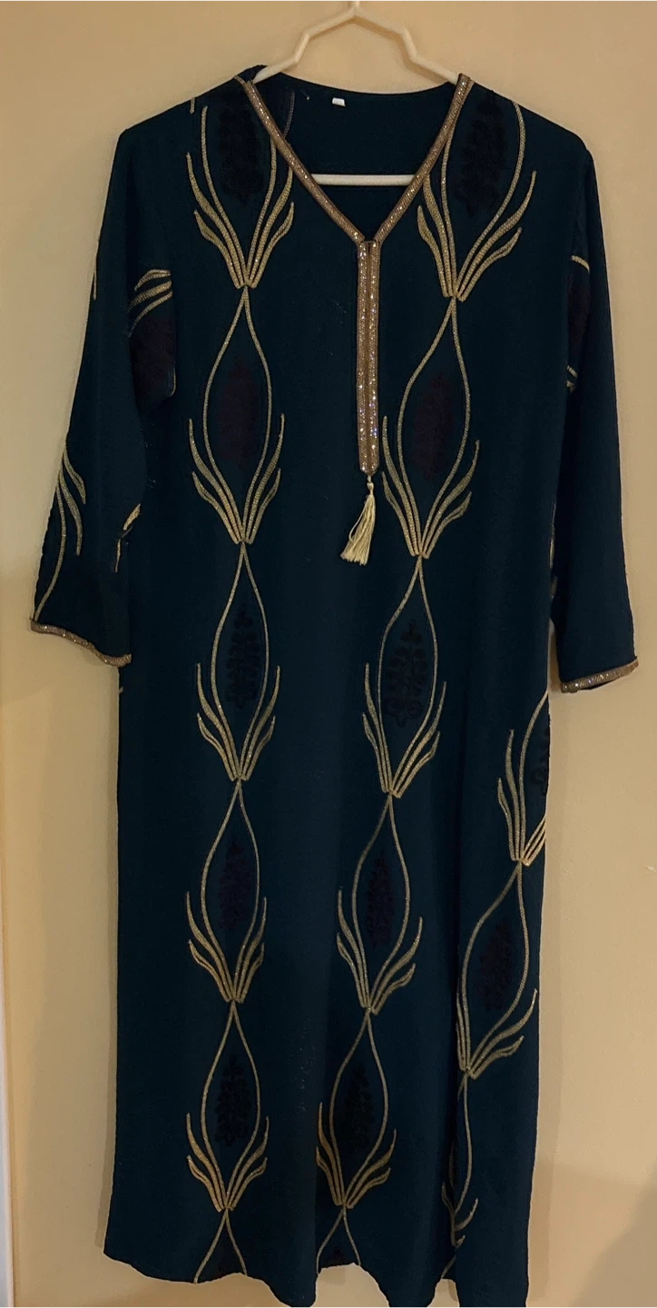 A beautiful teal dress featuring intricate gold embroidery and trim. It has a V-neckline with a decorative tassel and long sleeves. This dress is perfect for special occasions!