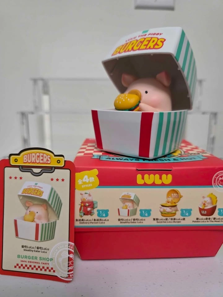 LULU Burger series - these have motion - can roll with wheels and lid pushes down - lulu eats burger - $15