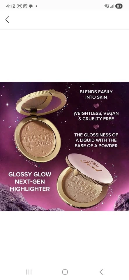 New, unused Too Faced Powder Highlighter in shade Summer Moon - bronzed rose gold. This is a discontinued shade, originally priced at $57. Selling for $30. I can bundle this with other items for a better price. Pick up is available in Scarborough near Kennedy and 401. I can also occasionally do pick-ups downtown Toronto near Queen and Victoria on days I work in that area. It's a next generation, second-skin, glossy-glow highlighter that gives a wet look finish. Free of parabens and mineral oil, and it's also gluten-free and cruelty-free. This easy-to-use powder formula leaves a radiant and luminous shimmer for a moonlit luminescence that’s out of this world. Plus, it smells like fresh crisp apples.