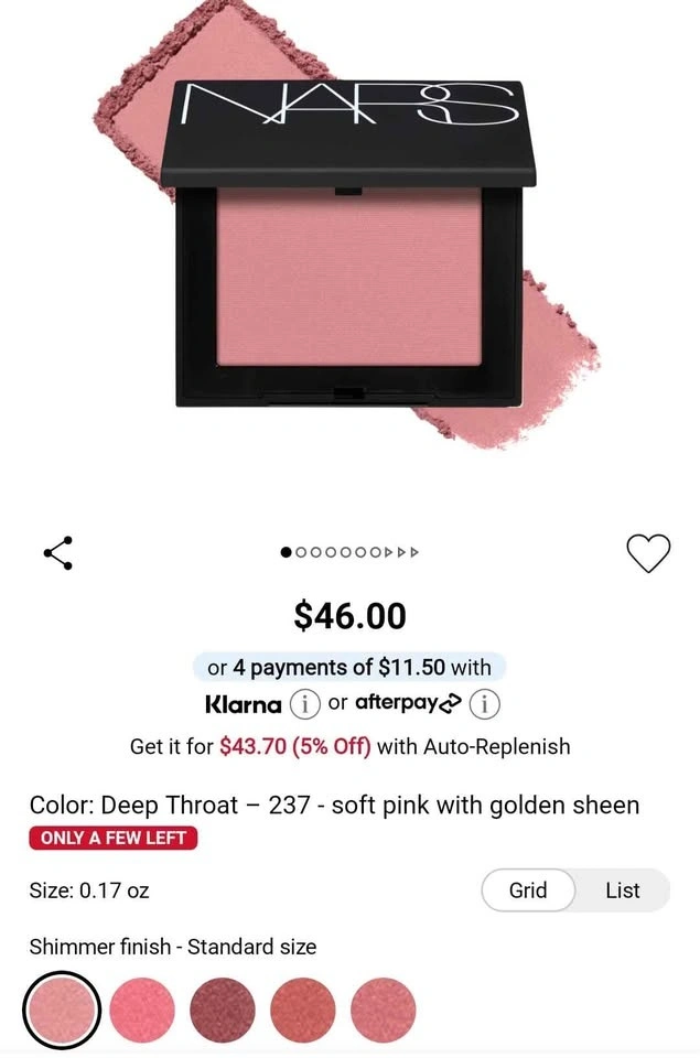 NARS talc free powder blush in shade Deep Throat, described as soft pink with golden sheen. Reg price $46 - selling for $30.