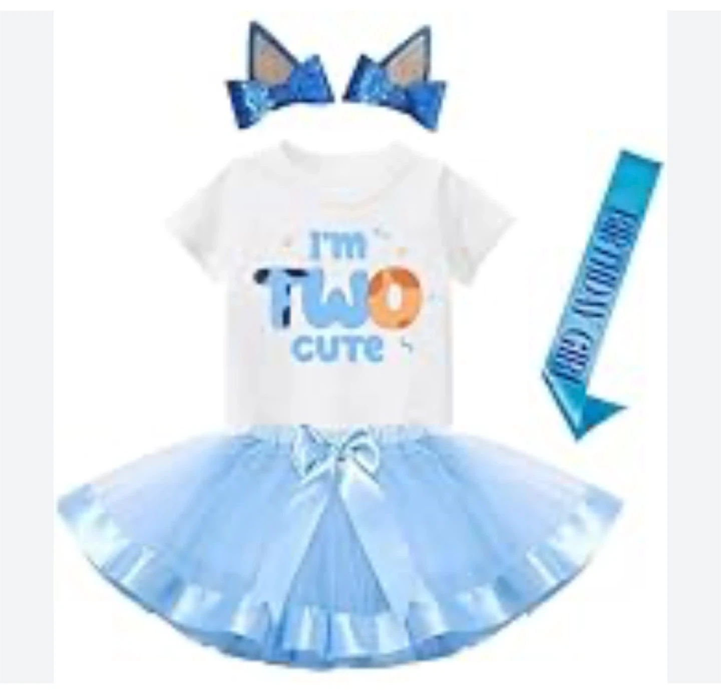 This cute outfit is perfect for a little one's second birthday celebration. It includes a "I'm Two Cute" t-shirt, a sparkly blue tutu, and a "Birthday Girl" sash. The t-shirt is white with blue and orange lettering, and the tutu has a matching blue bow. It's a fun set to make her special day even more memorable!