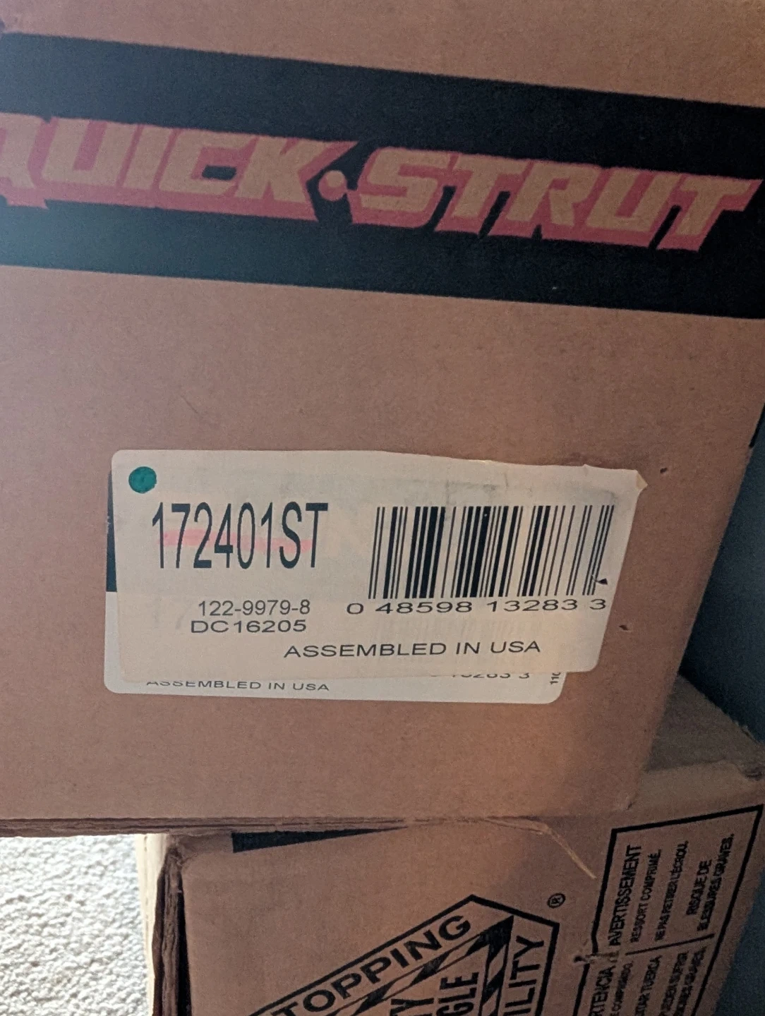 This is a pair of Monroe Quick-Strut complete strut assemblies. The part number is 172401ST. They were assembled in the USA. This assembly is designed for the front of a vehicle.