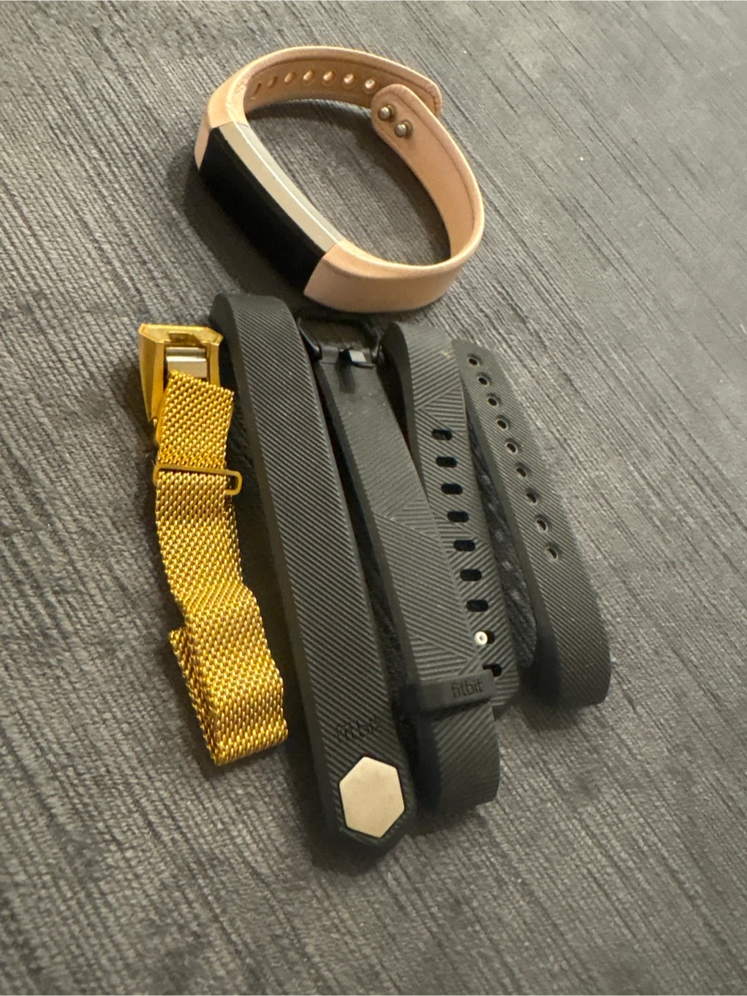 Fitbit Alta fitness tracker with multiple bands. Includes the original pink band, a gold mesh band, and three black sport bands. It's a great way to track your daily activity!