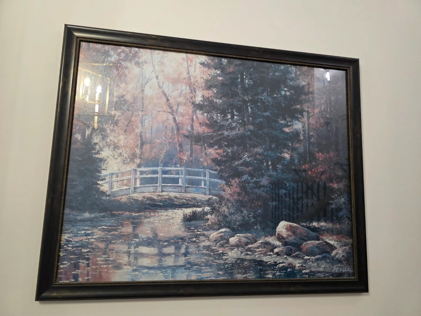 This is a framed landscape print featuring a serene scene with a white bridge over a stream, surrounded by trees. The print is housed in a dark, ornate frame. It adds a touch of nature to any room!