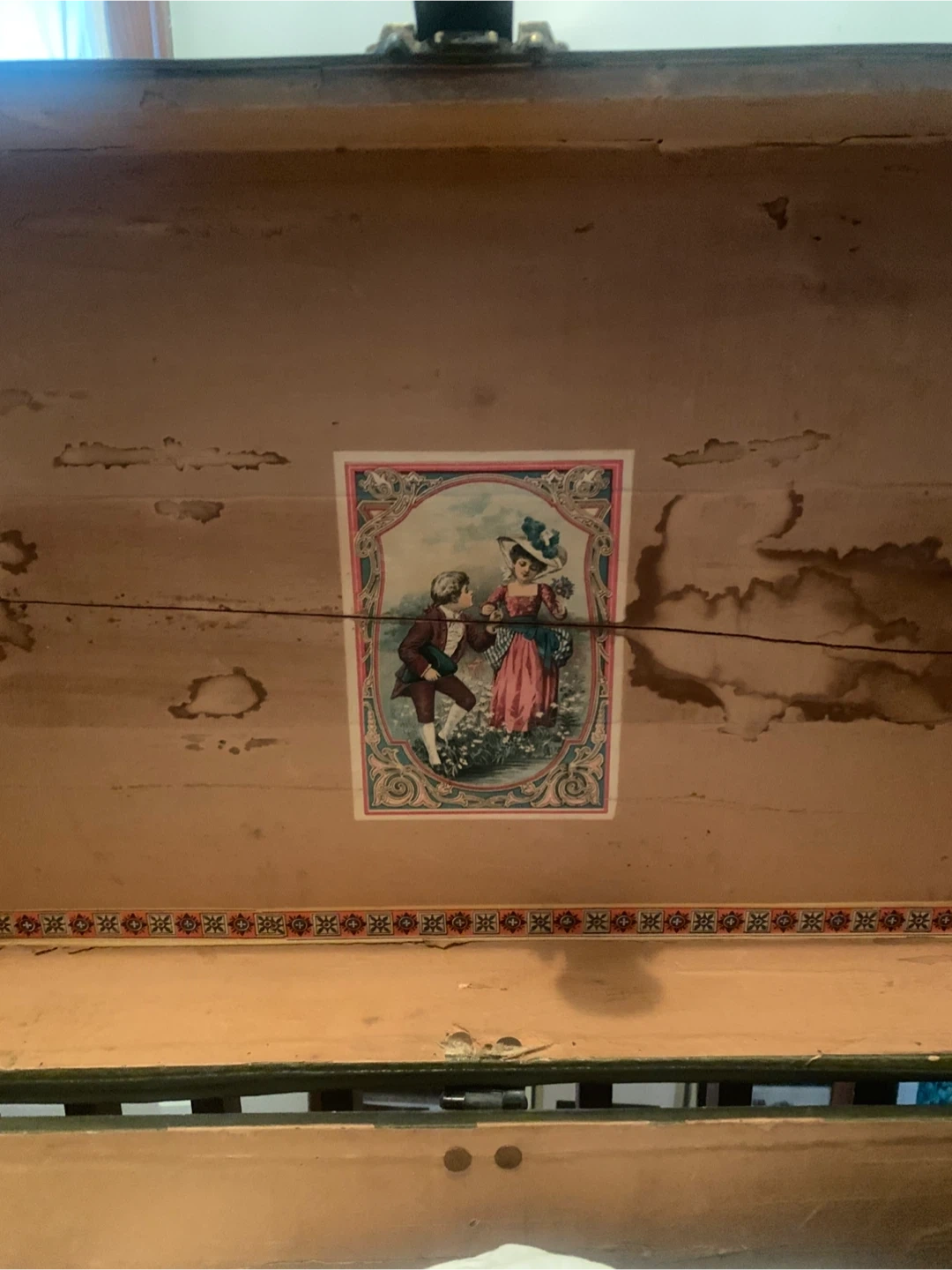 This is a vintage steamer trunk with decorative lithograph inside and metal hardware. It has a green and wood exterior. It's a substantial piece perfect for storage or decor.