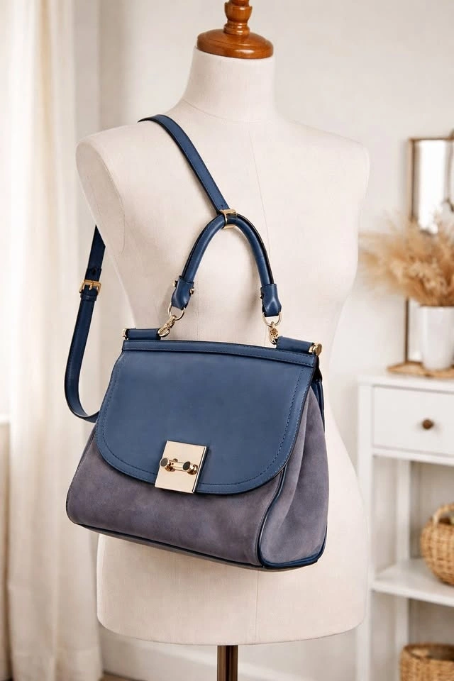 Beautiful and stylish blue purse made with 100% leather and soft suede accents. This bag has a timeless, classy look that works perfectly for everyday use or dressier outings.