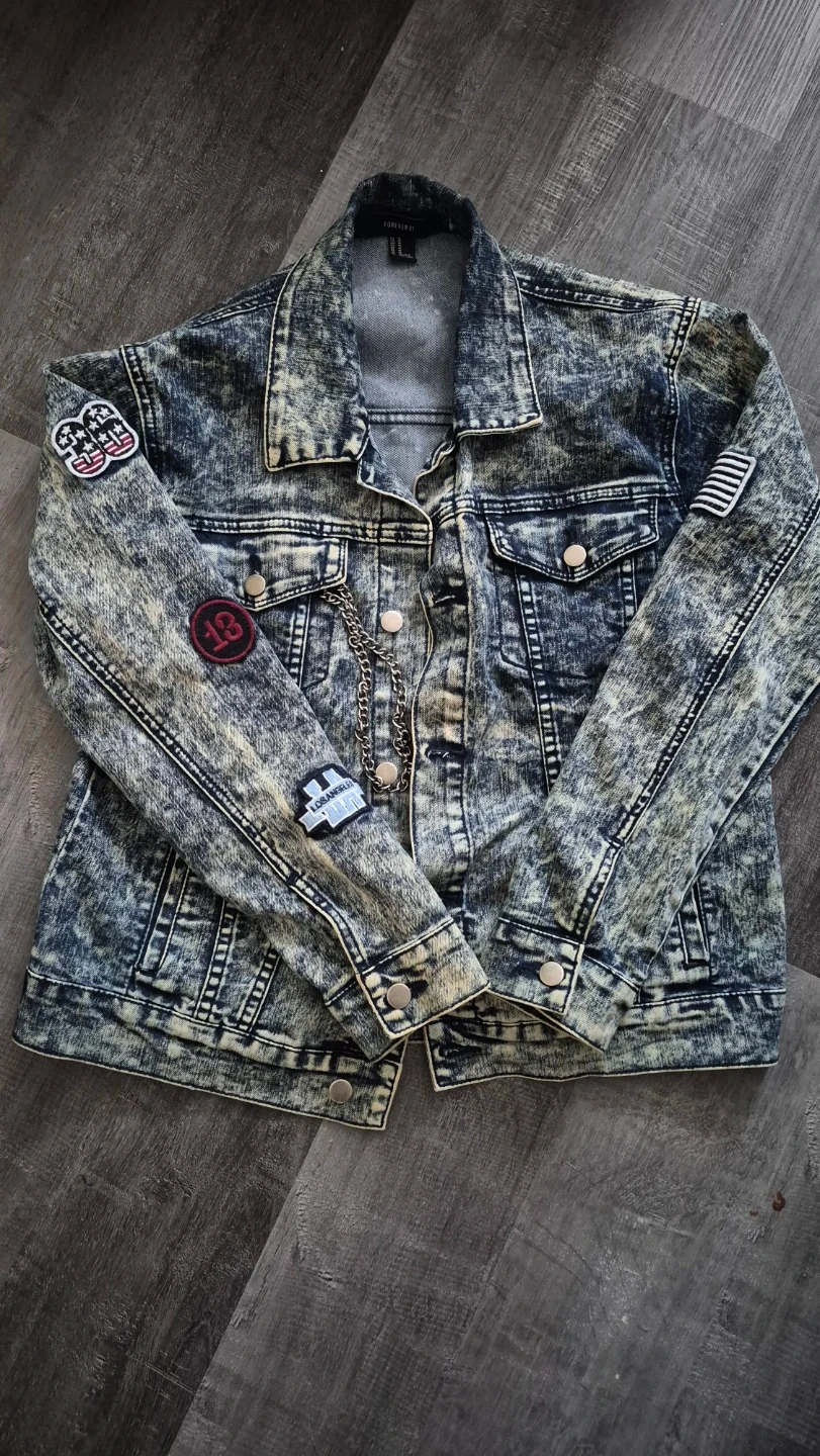 This Forever 21 denim jacket features an acid wash design. It's a size medium with decorative patches on the sleeves and a chain detail. The jacket is made of denim.