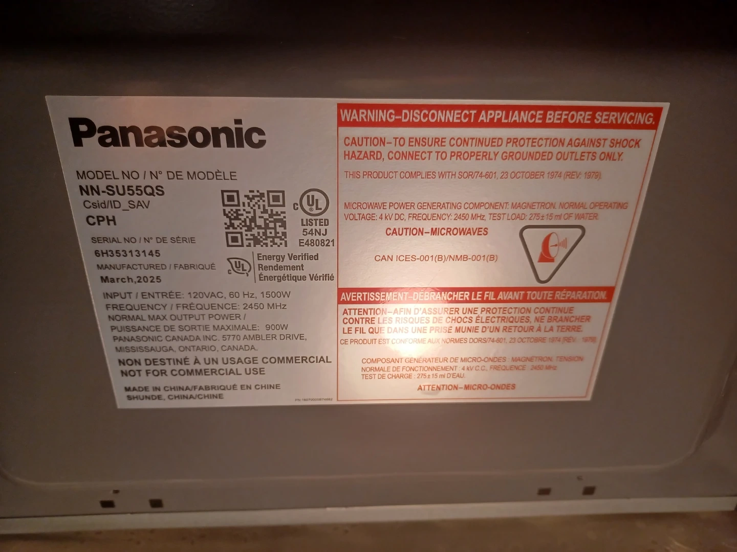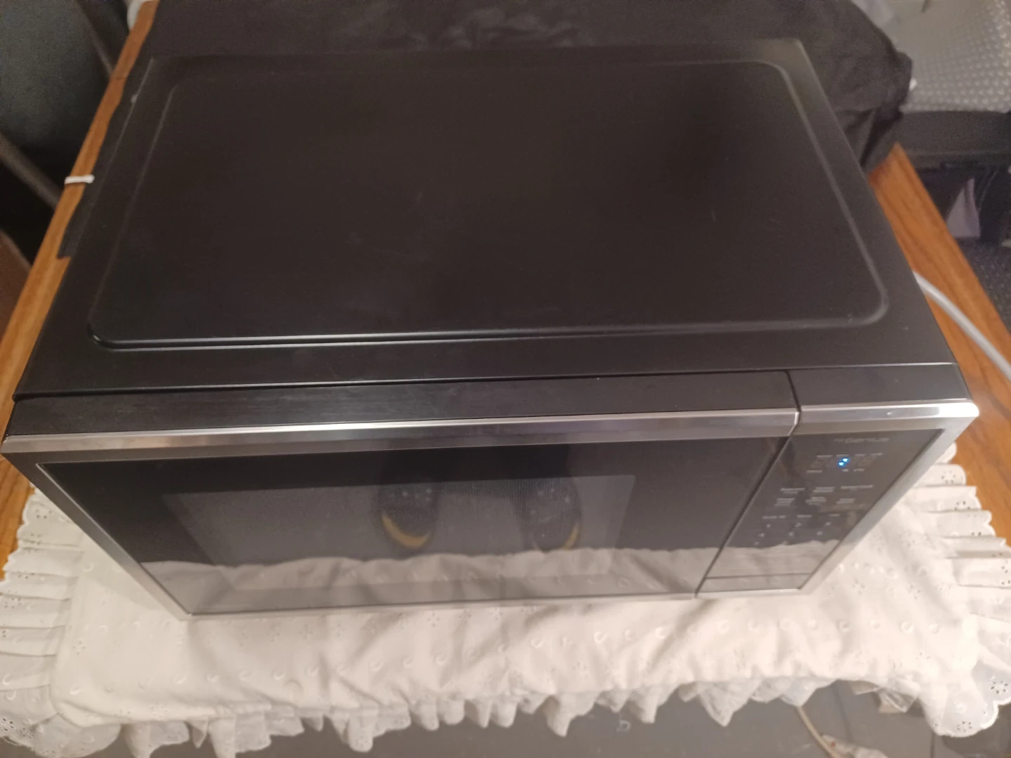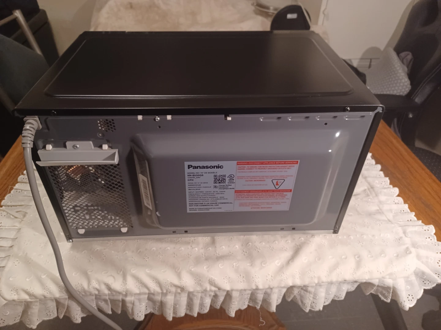 This is a black Panasonic Genius microwave oven. It features a turntable and a digital display. It has various quick cook settings for convenience. Very clean. Manufactured : 2025.