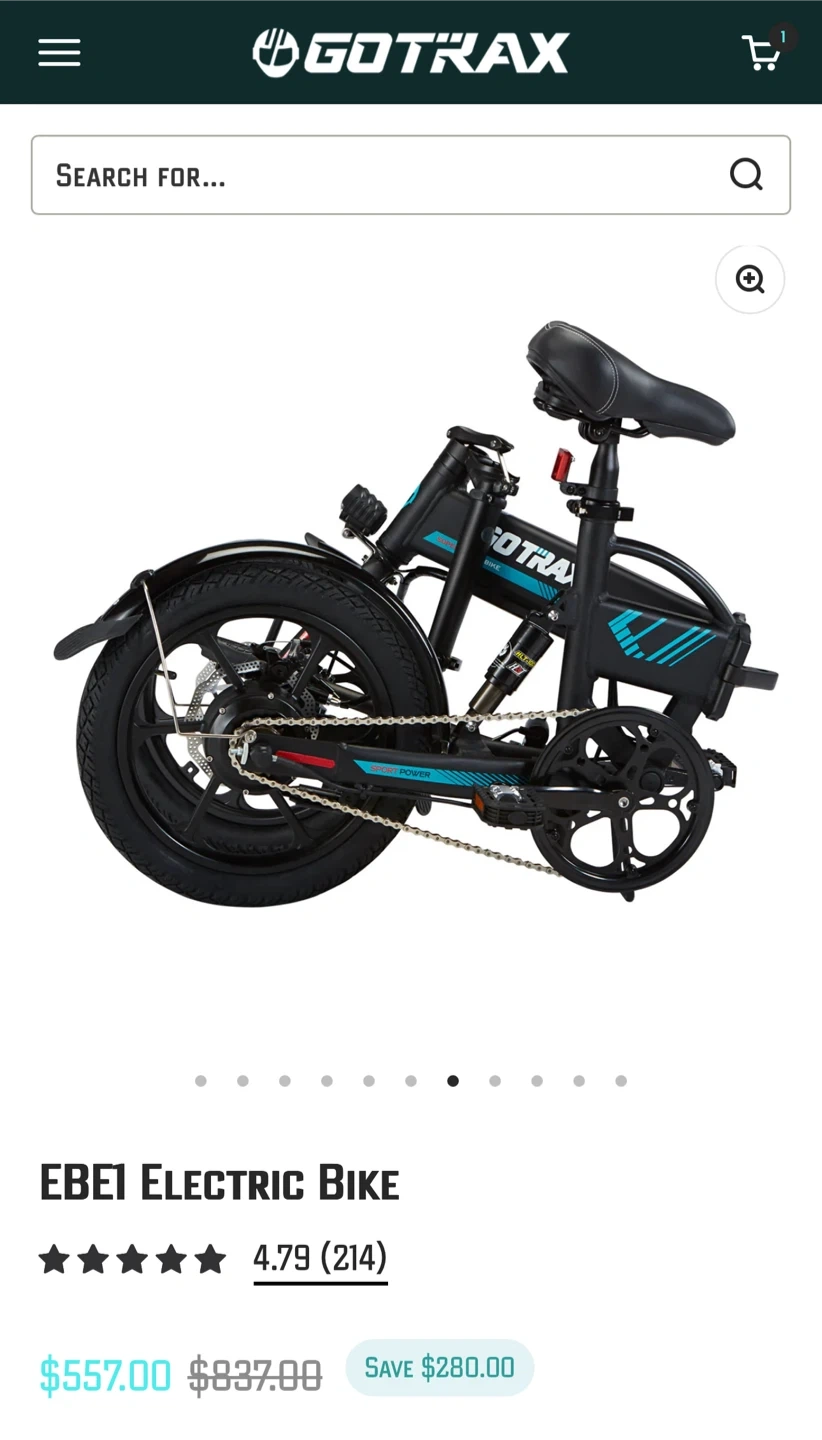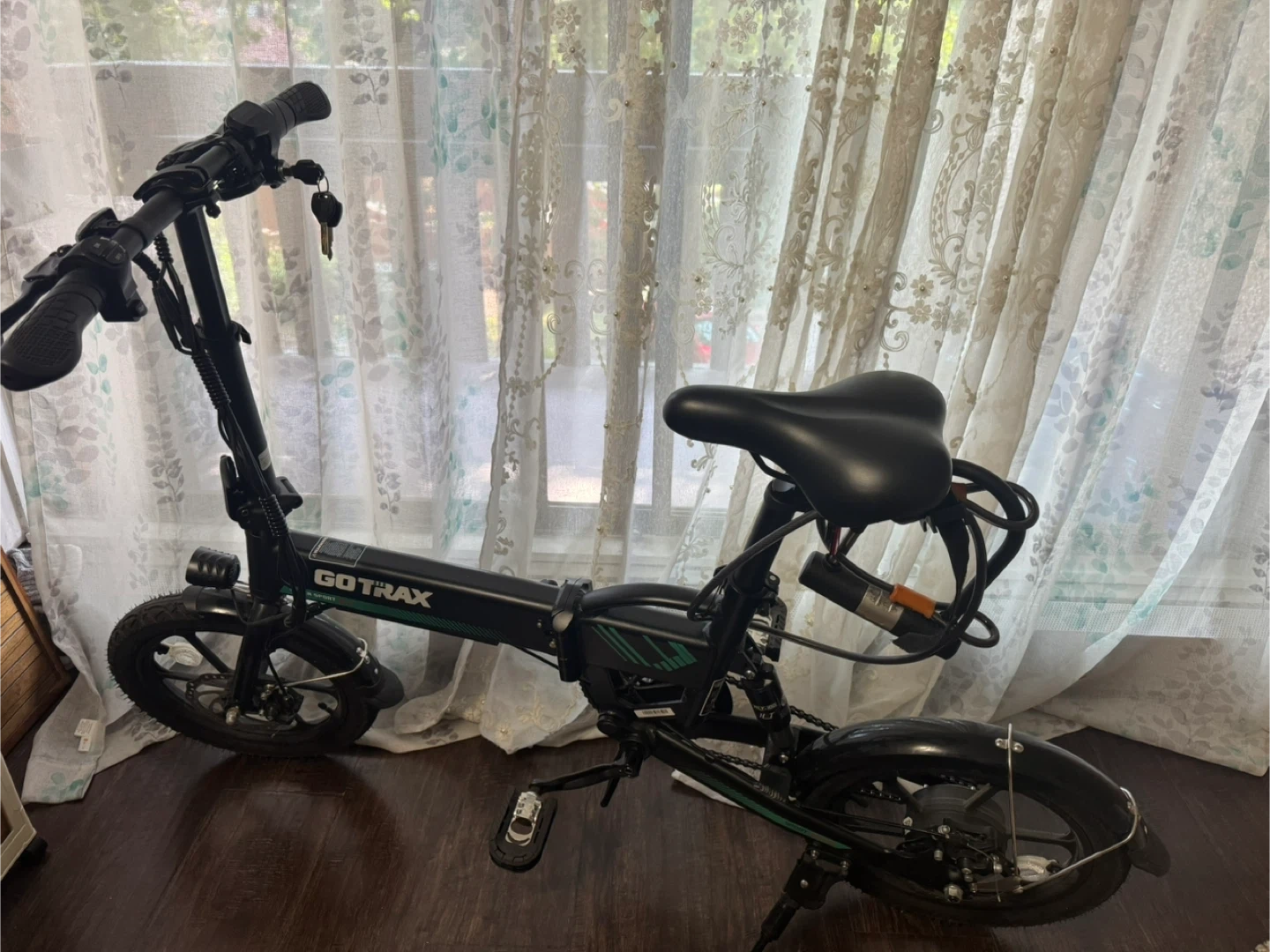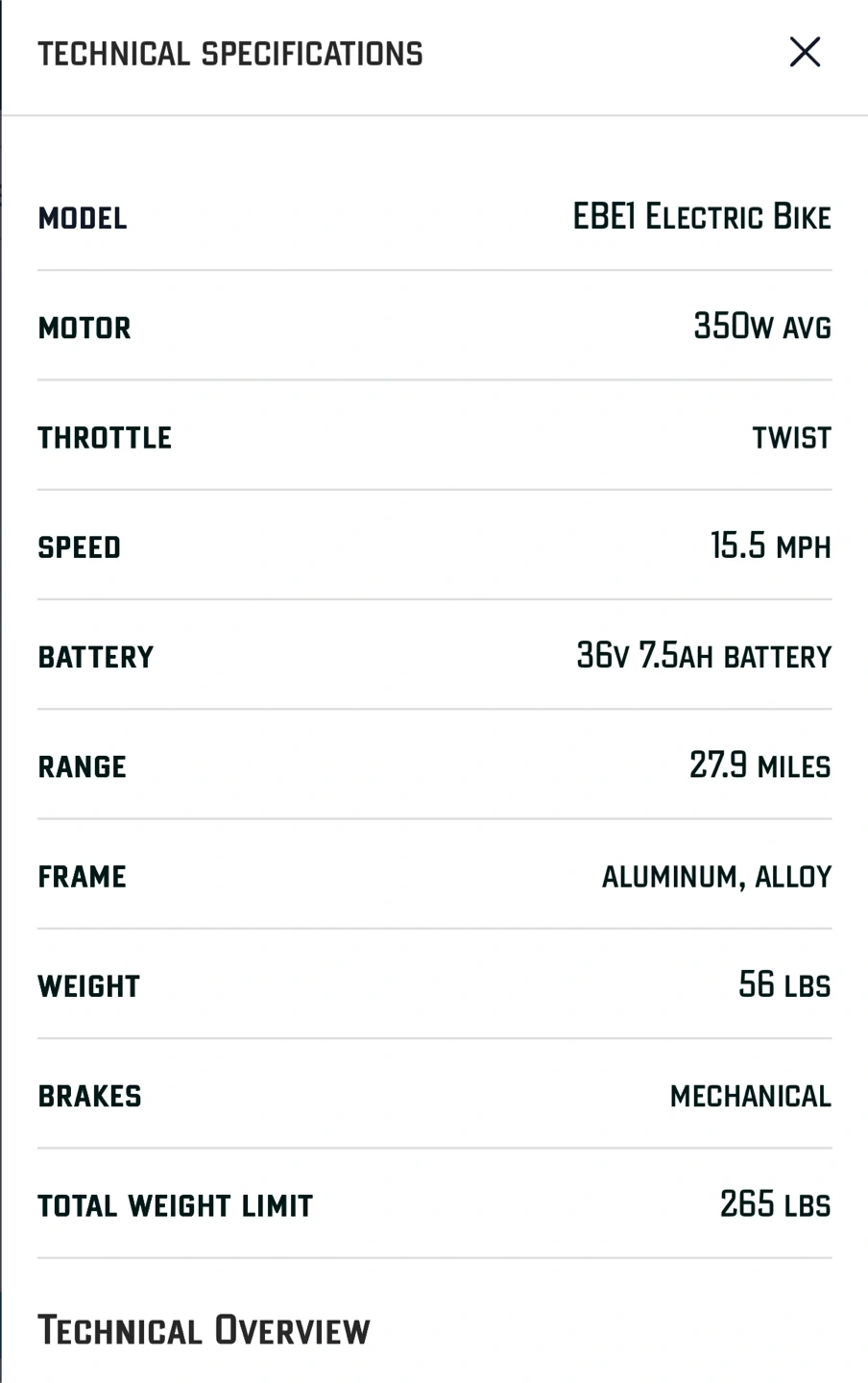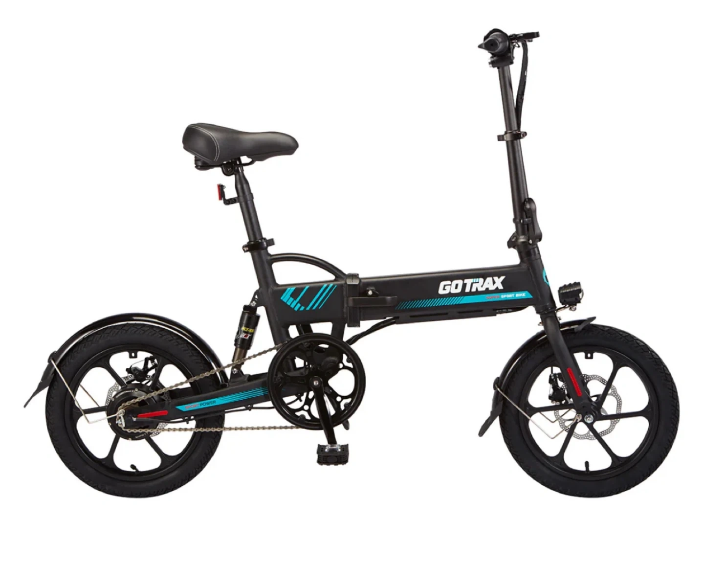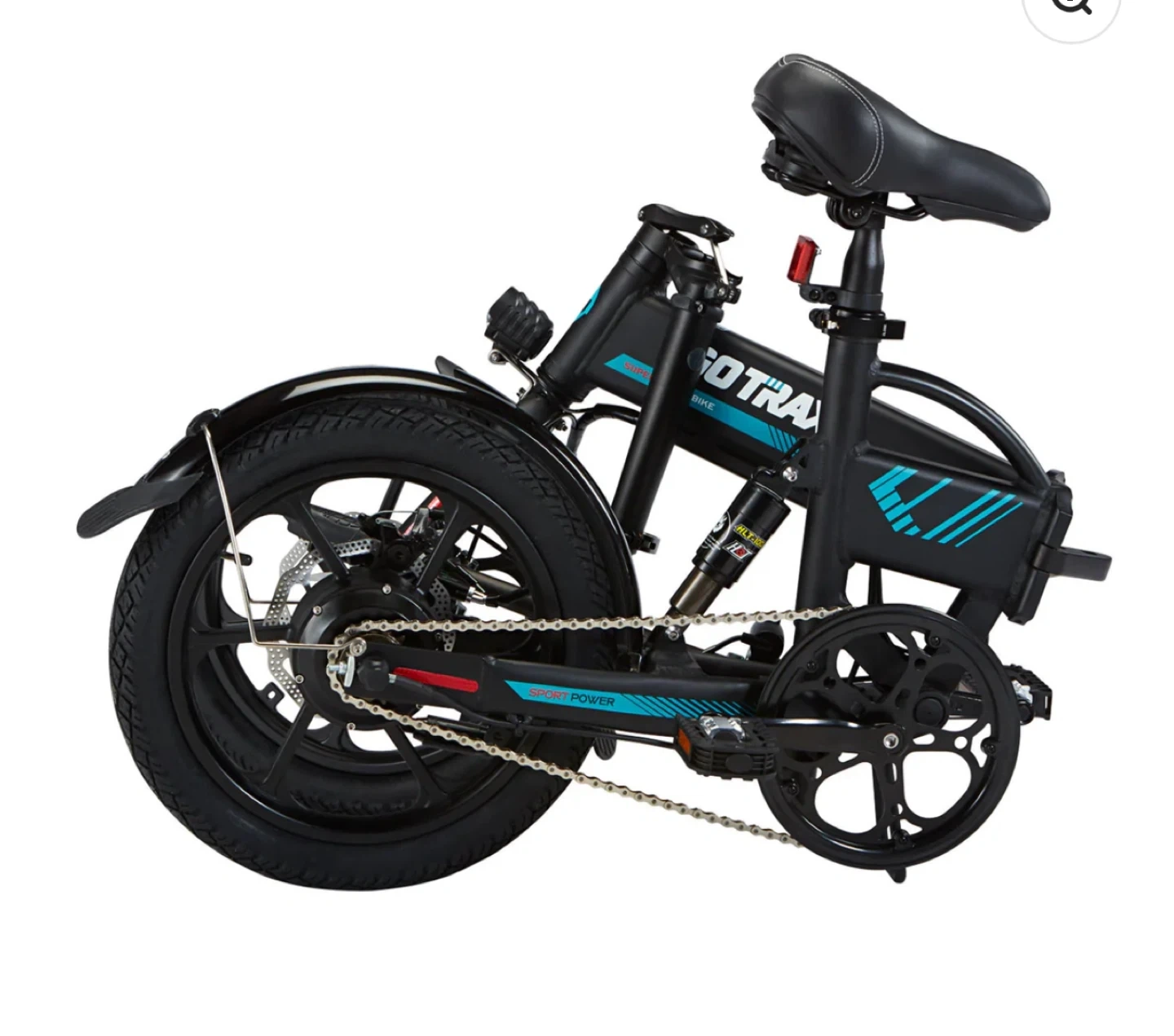 This GOTRAX EBE1 electric bike features a 350W motor and 16" tires. It has a 36V 7.5Ah battery offering up to 27.9 miles of range. The frame is aluminum alloy and it's a folding design for easy storage. Max payload is 265 lbs.