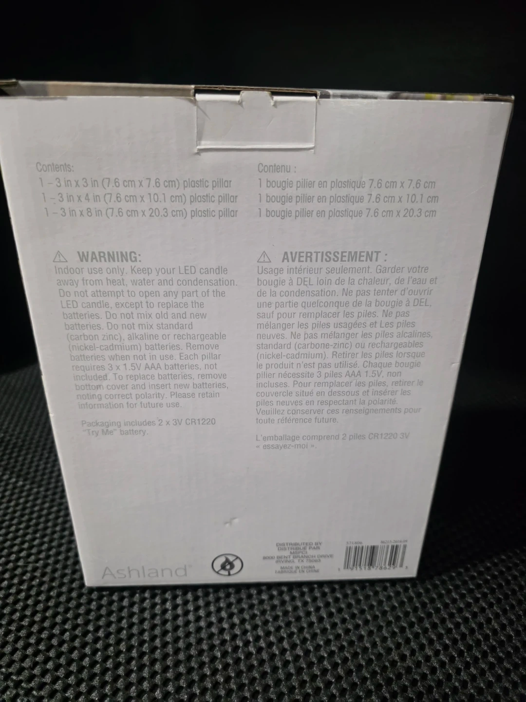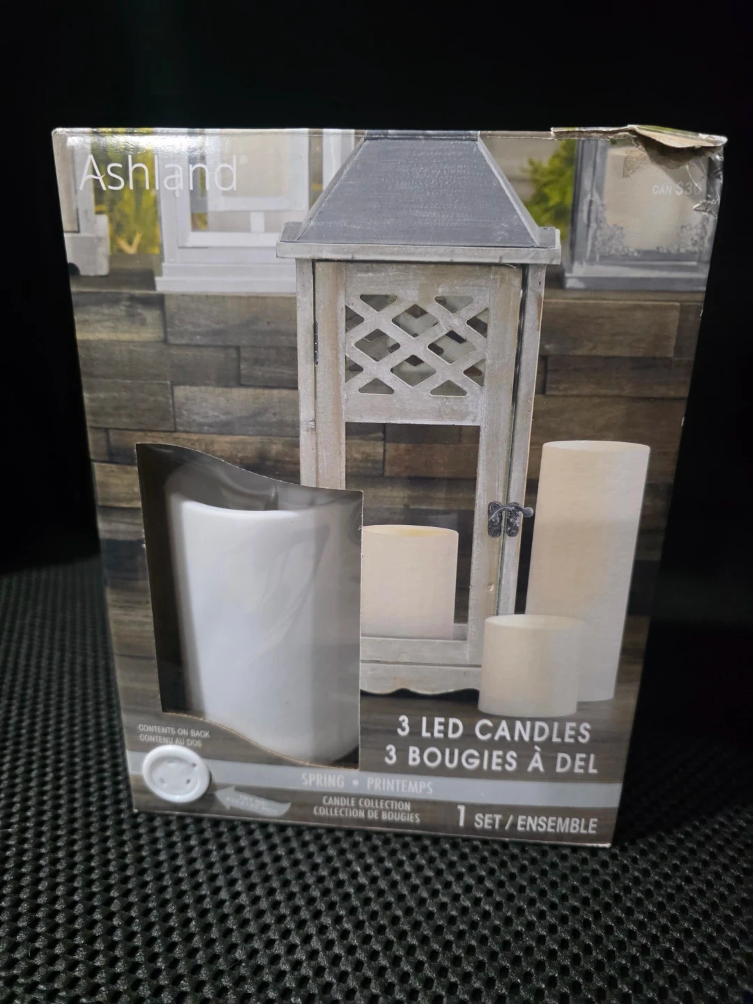 Set of 3 LED candles in plastic pillar style. Includes sizes 1-3 in x 3 in, 1-3 in x 4 in, and 1-3 in x 8 in. Packaging includes 2 x CR1220 try me batteries. check out my other listings for bundle offers!