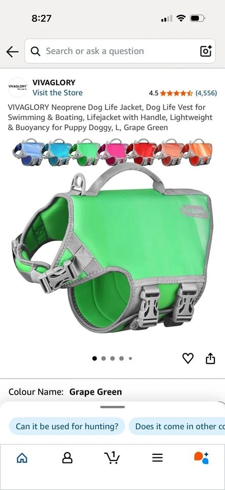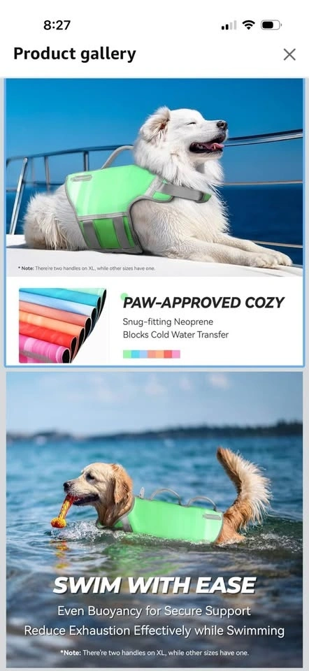 Brand new in sealed box! Large (size chart in photos). This VIVAGLORY dog life jacket has a neoprene outer layer and lining for superior comfort and extra warmth. It's designed for your dog’s freedom of movement, offering a secure fit without restriction and excellent durability. The wave-patterned print adds a fun summer swimming and beach feel. Thick buoyant foam filling in the neck, back, and sides ensures even flotation distribution, reducing fatigue and allowing your dog to move more freely and comfortably in the water. Great for boating, surfing, rafting, kayaking, or other water activities. The durable rescue handle allows you to quickly lift your dog out of the water in emergencies. The D-ring on the back is for leash attachment for better control. Reflective printing and bright colors enhance visibility in low-light conditions for added security. Neck and belly straps feature touch fasteners and quick-release buckles for easy on and off in seconds. Adjustable straps ensure a secure hold that won’t easily slip off. Let me know if you're interested!
