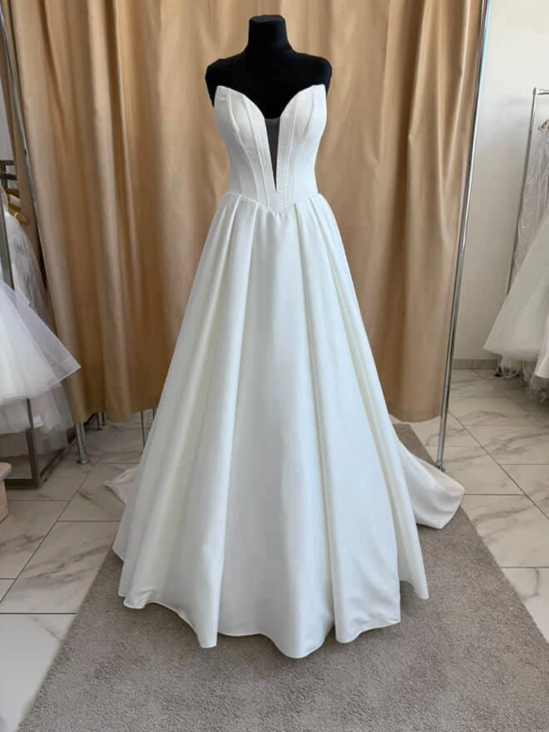 The dress is made of high-quality satin with an elegant structured corset and a convenient bustle for lifting the train.