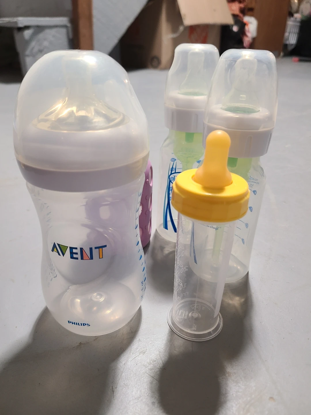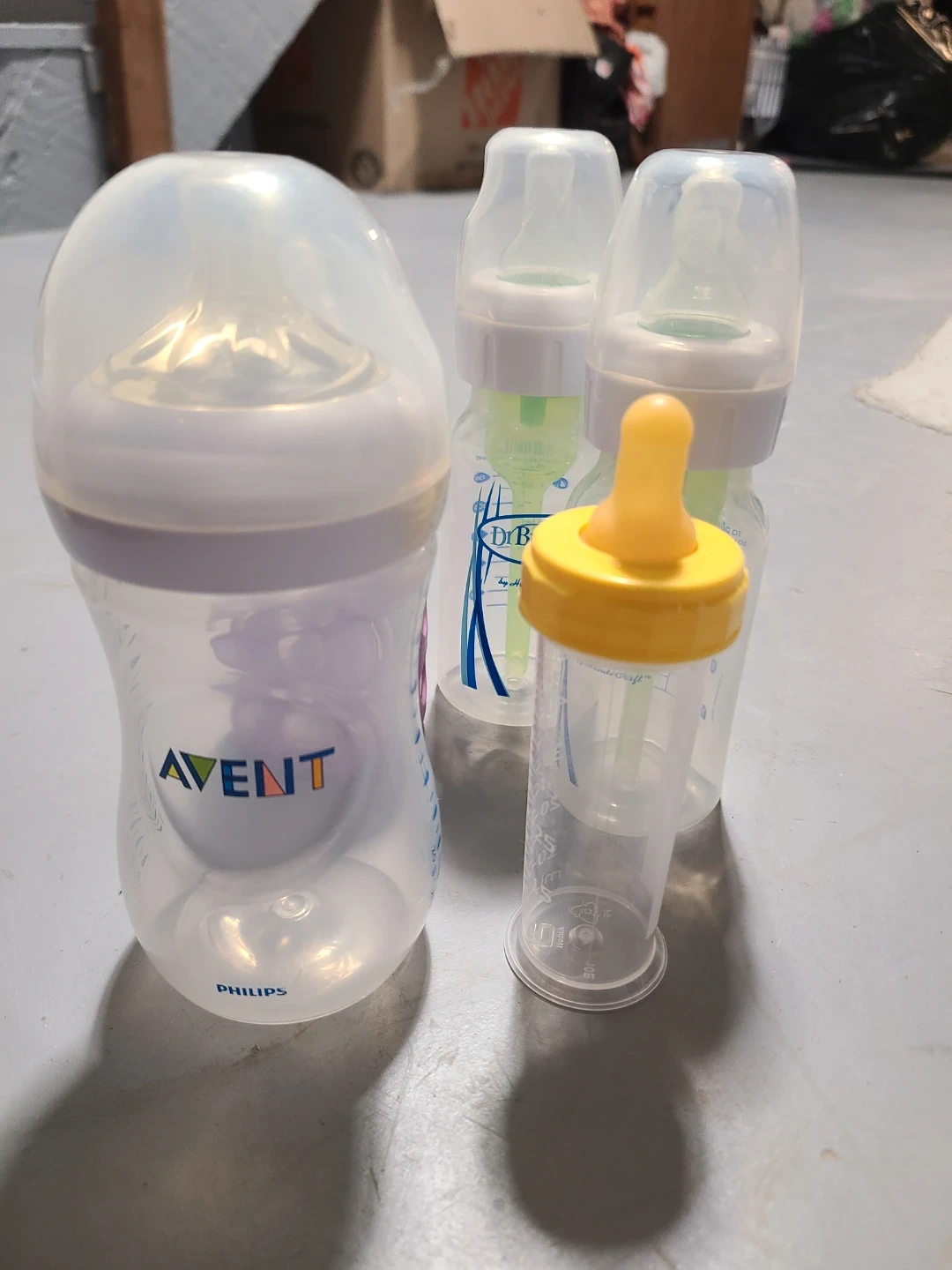 Set of Philips Avent baby bottles. Includes one larger Avent bottle and three smaller Dr. Brown's bottles. These are BPA-free plastic bottles.