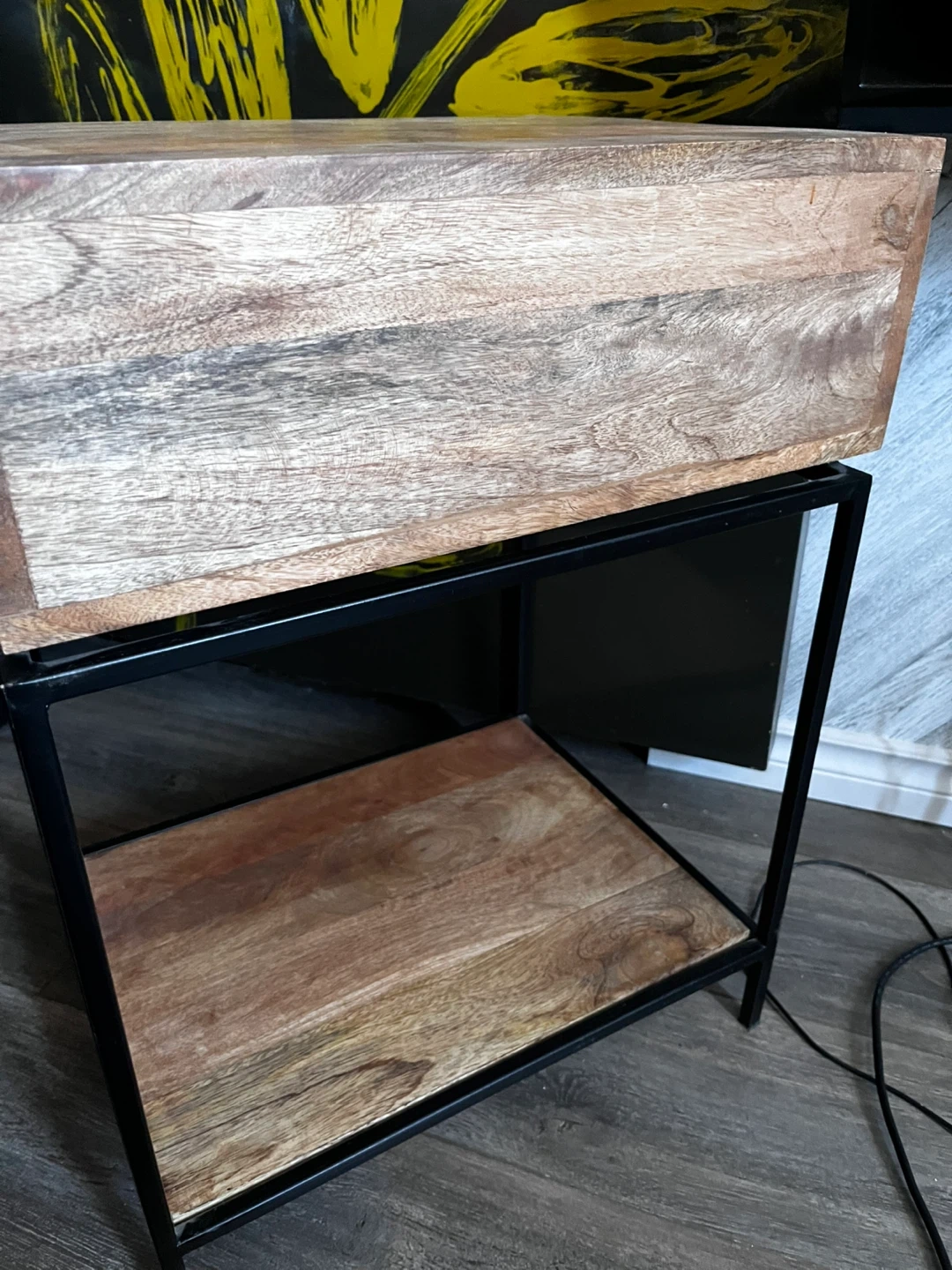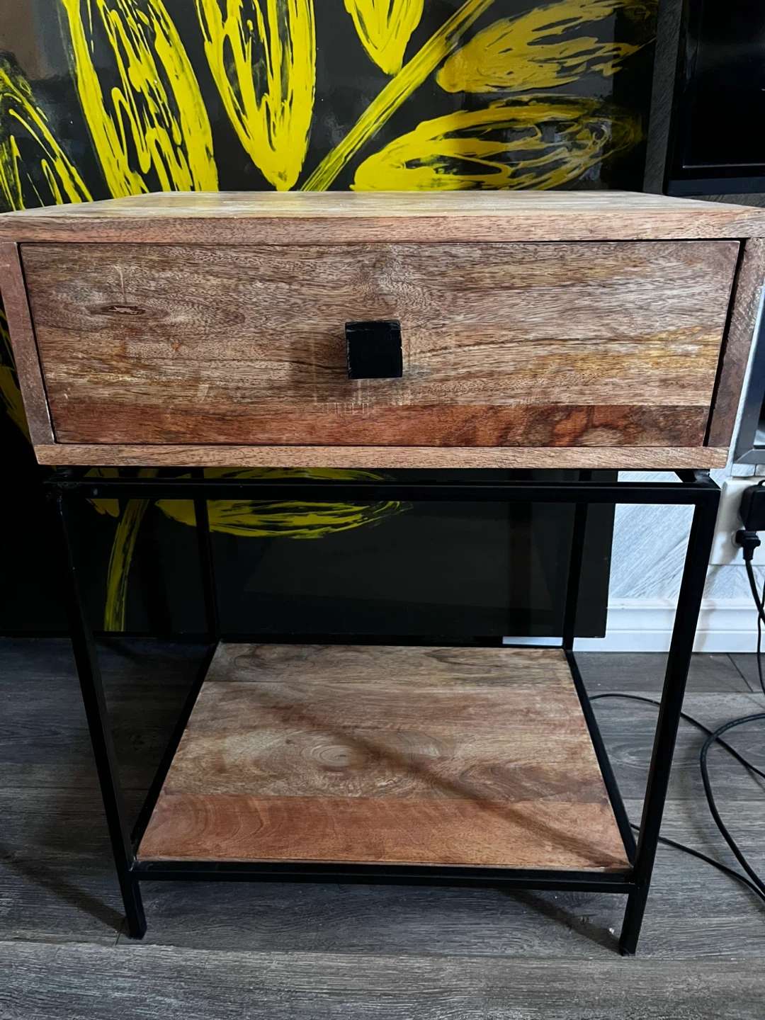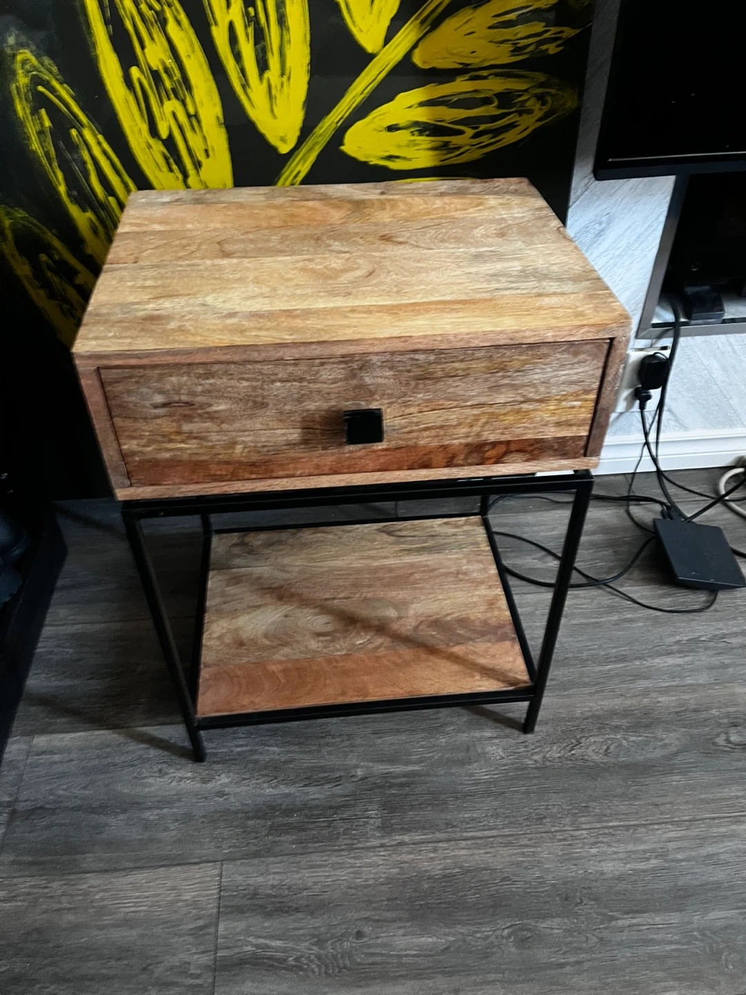 Features a wooden top, black metal frame, drawer and shelf. Perfect for additional storage and organization in bedroom or living room. Measures at 18”L x 14”D x 25.5”H. Pick up only. Closest intersection is Jane St am Eglinton Ave.