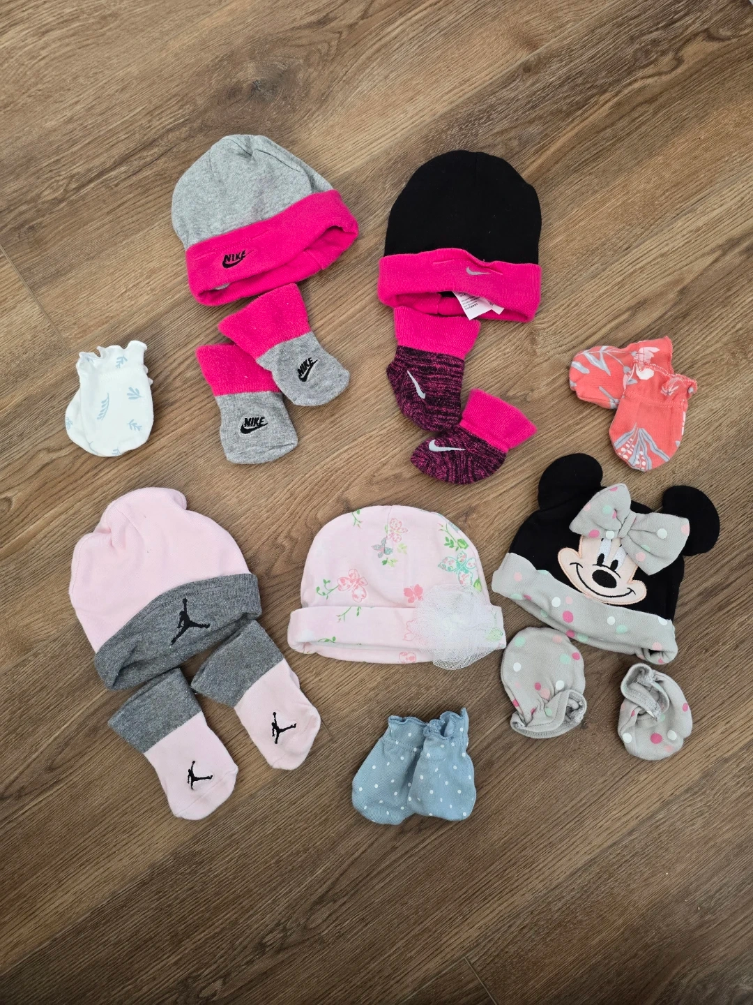 This newborn bundle includes a variety of baby girl outfits that are gently used. You'll find a red buffalo check dress with bloomers, a white onesie and denim pants set, a grey bunny long-sleeve onesie, a pink "Born to Sparkle" onesie with pants and two hats, a hedgehog print long-sleeve onesie with pink striped pants, hats, socks, mitts, as well as an aden + anais sleep sack. Perfect for dressing up your little one!