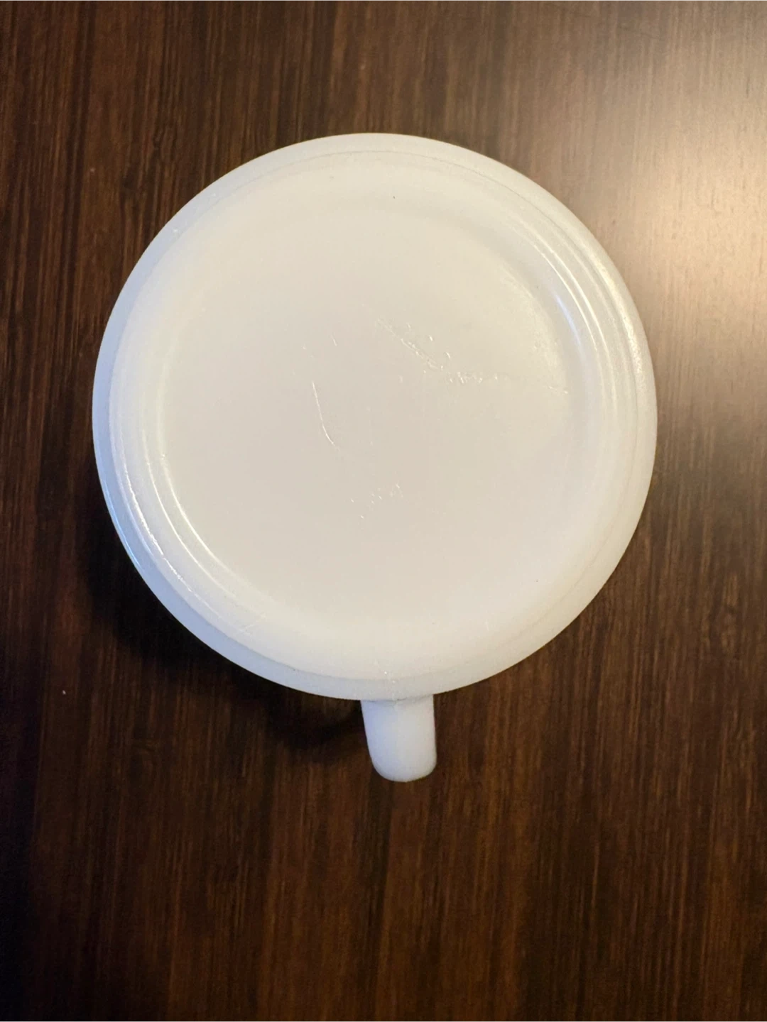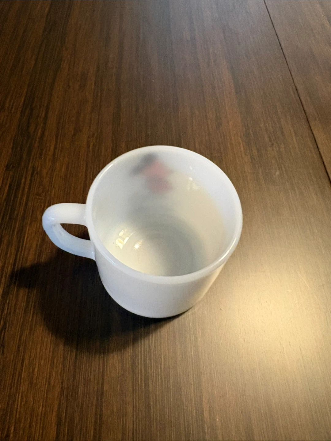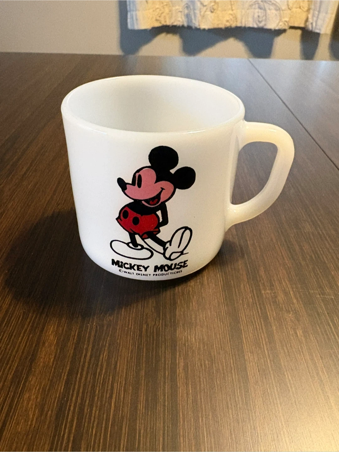This is a classic white milk glass mug featuring the iconic Mickey Mouse. It's perfect for enjoying your morning coffee or tea. The mug's sturdy design makes it a great addition to any Disney fan's collection.