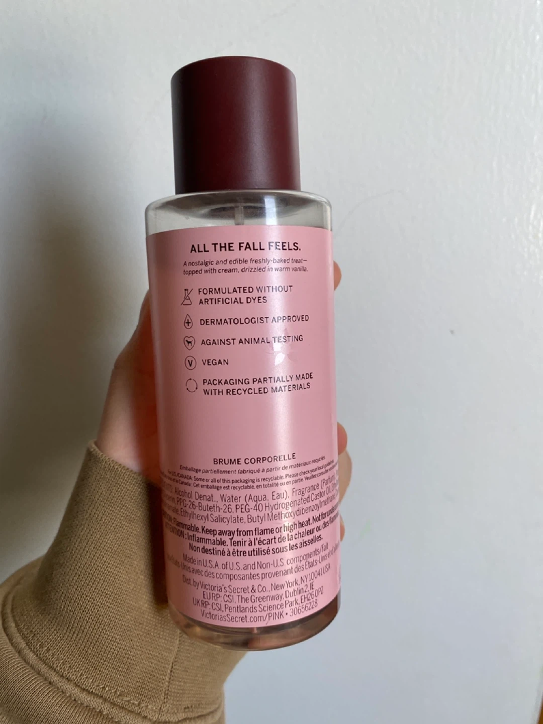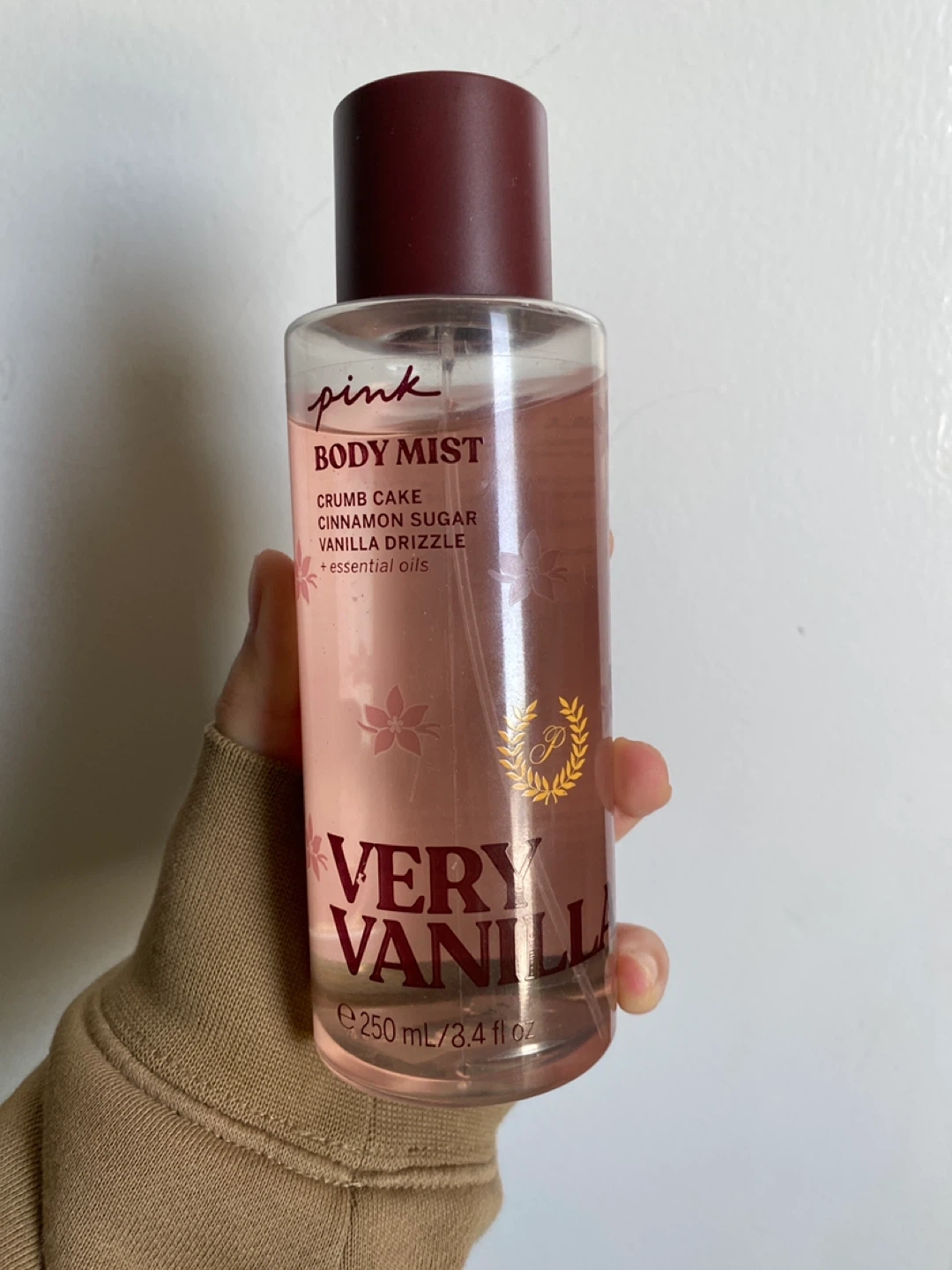 Victoria's Secret Pink Very Vanilla Body Mist. Crumb cake, cinnamon sugar, vanilla drizzle scent. Formulated without artificial dyes and vegan. Dermatologist approved. 250ml / 3.4 fl oz.