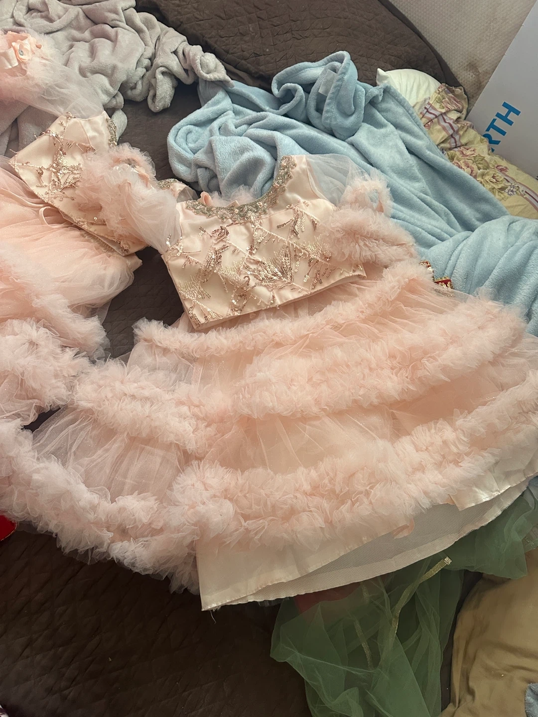 This pretty pink dress features a sequined bodice and layers of ruffled tulle. It's perfect for parties or special occasions. The dress is made of soft, lightweight fabric.