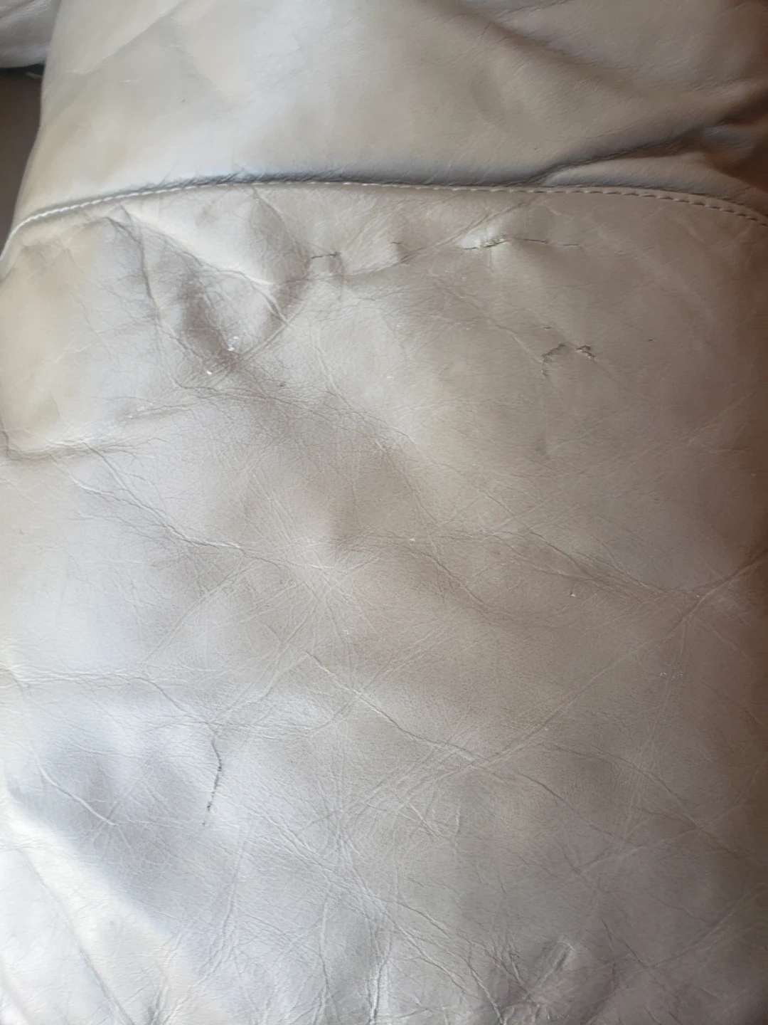 Comfortable taupe leather armchair. It's a generously sized chair with plush cushioning. The leather shows some signs of wear, including minor scuffs and creasing. Includes one yellow velvet throw pillow. This chair would fit well in a living room or den.