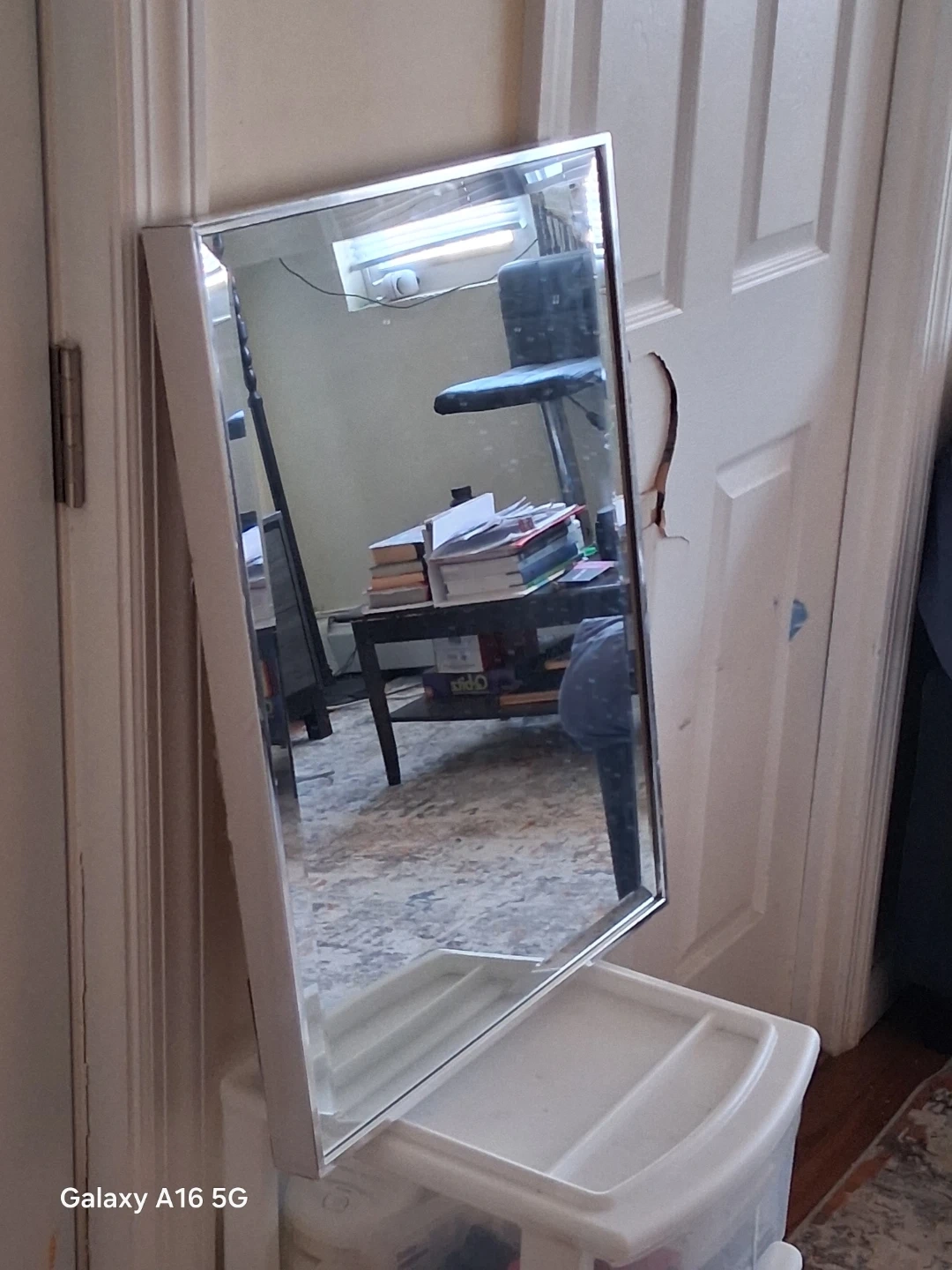 This is a framed wall mirror. It has a silver-toned frame. The paperback has some wear but the mirror itself is intact.