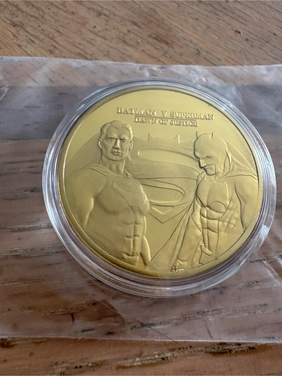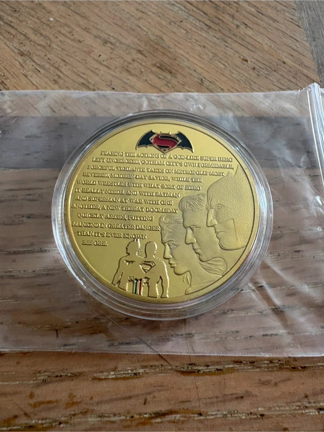 A collectible coin featuring Batman and Superman from the Dawn of Justice movie. The coin has a gold-tone finish and displays intricate embossed designs on both sides, including text detailing the movie's premise. This piece is a nice addition for any fan of DC Comics or superhero memorabilia.