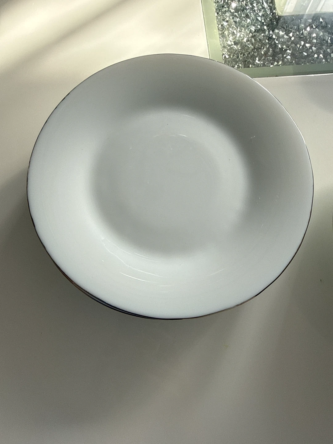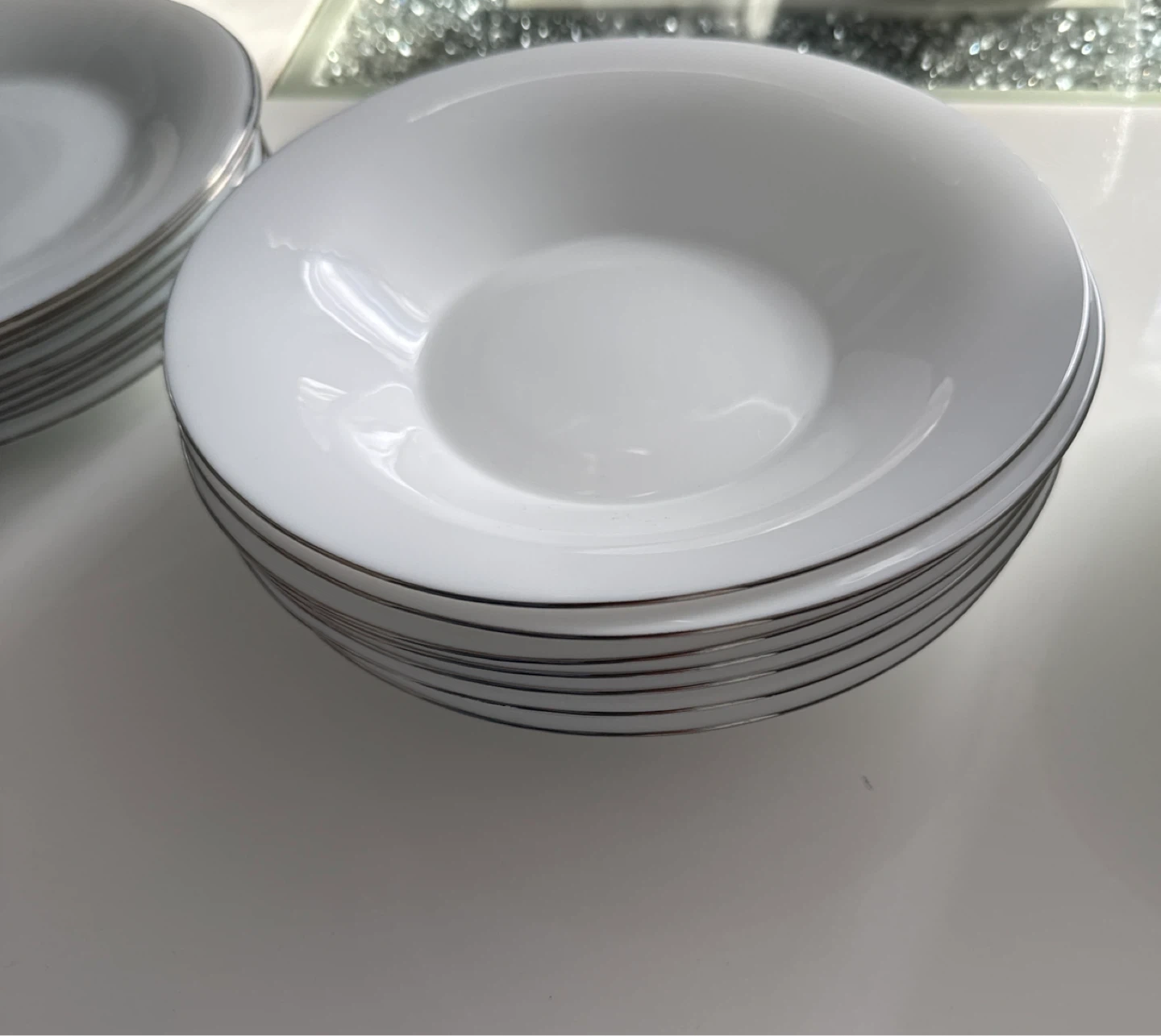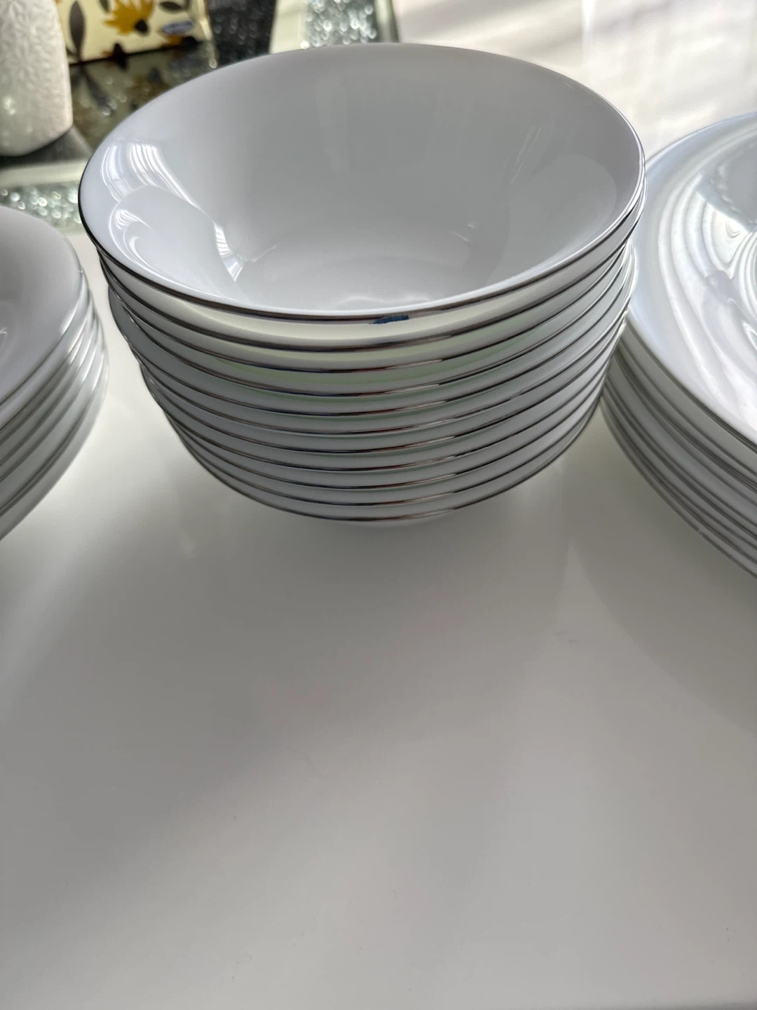 Set of white porcelain plates and bowls with a thin silver rim. These are great for everyday use or for special occasions. Dishwasher and microwave safe.