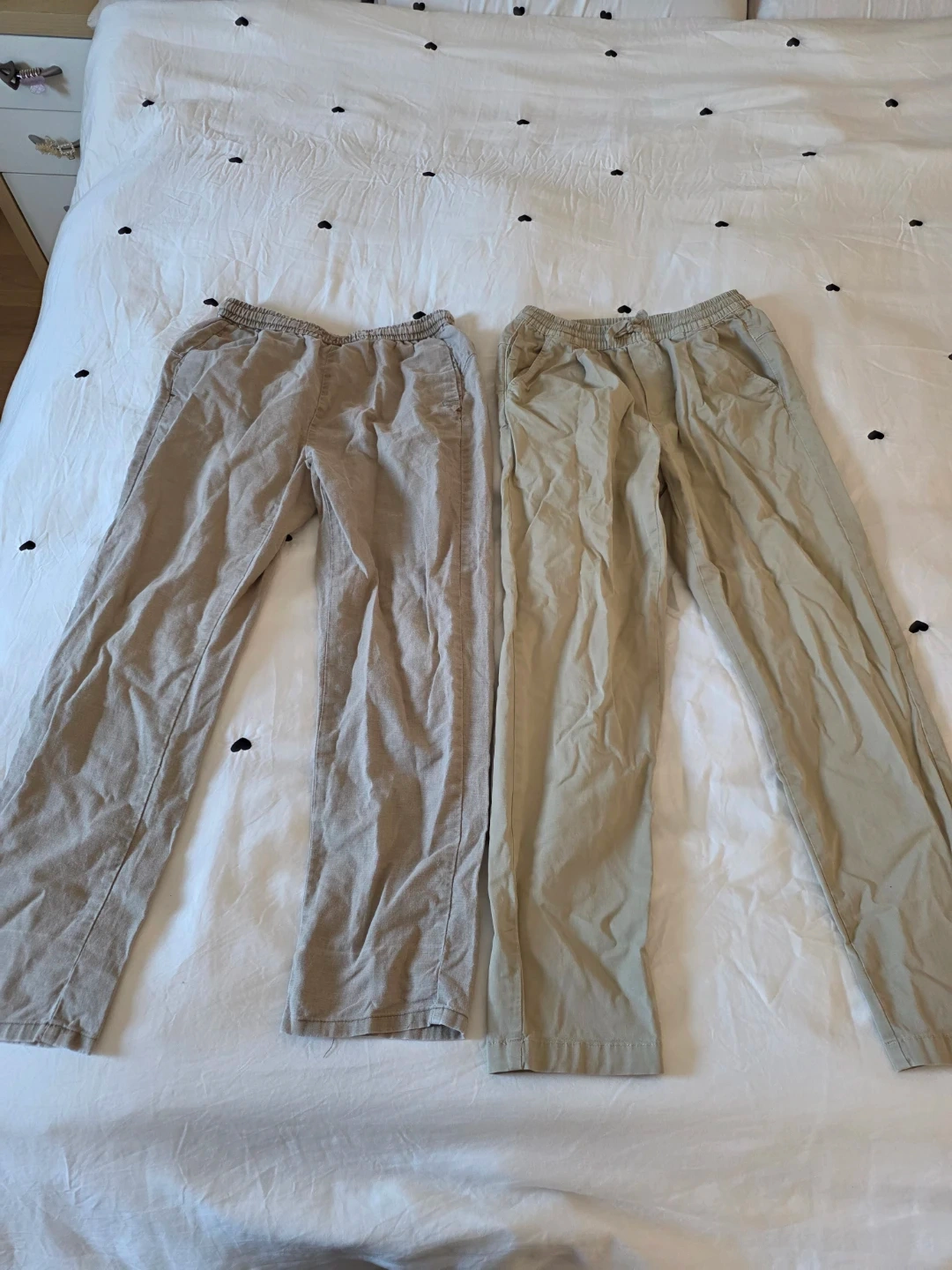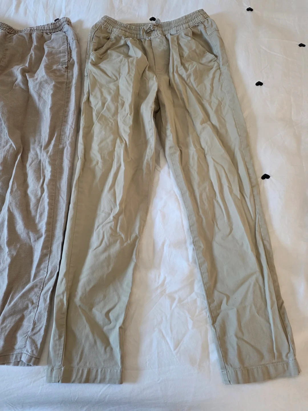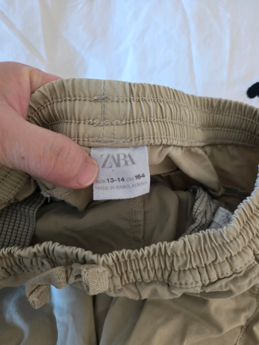 Two pairs of Zara kids pants in beige colours. One pair is size 11-12 years (152 cm) and the other is size 13-14 years (164 cm). Both are made in Bangladesh., all pants are either wear once or never worn, kids out grown quickly at this age, very comfortable at summer time, 2 for 15