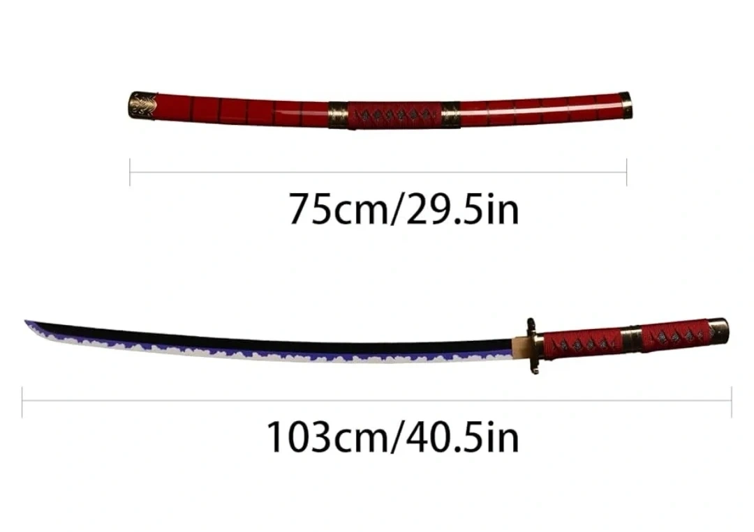 Lightweight Roronoa Zoro cosplay katana made of plastic. Total length 103cm, blade length 70cm, handle length 28cm, sheath length 75cm. The handle's soft rope wrap provides a comfy grip. Includes sword, belt, and sword holder.