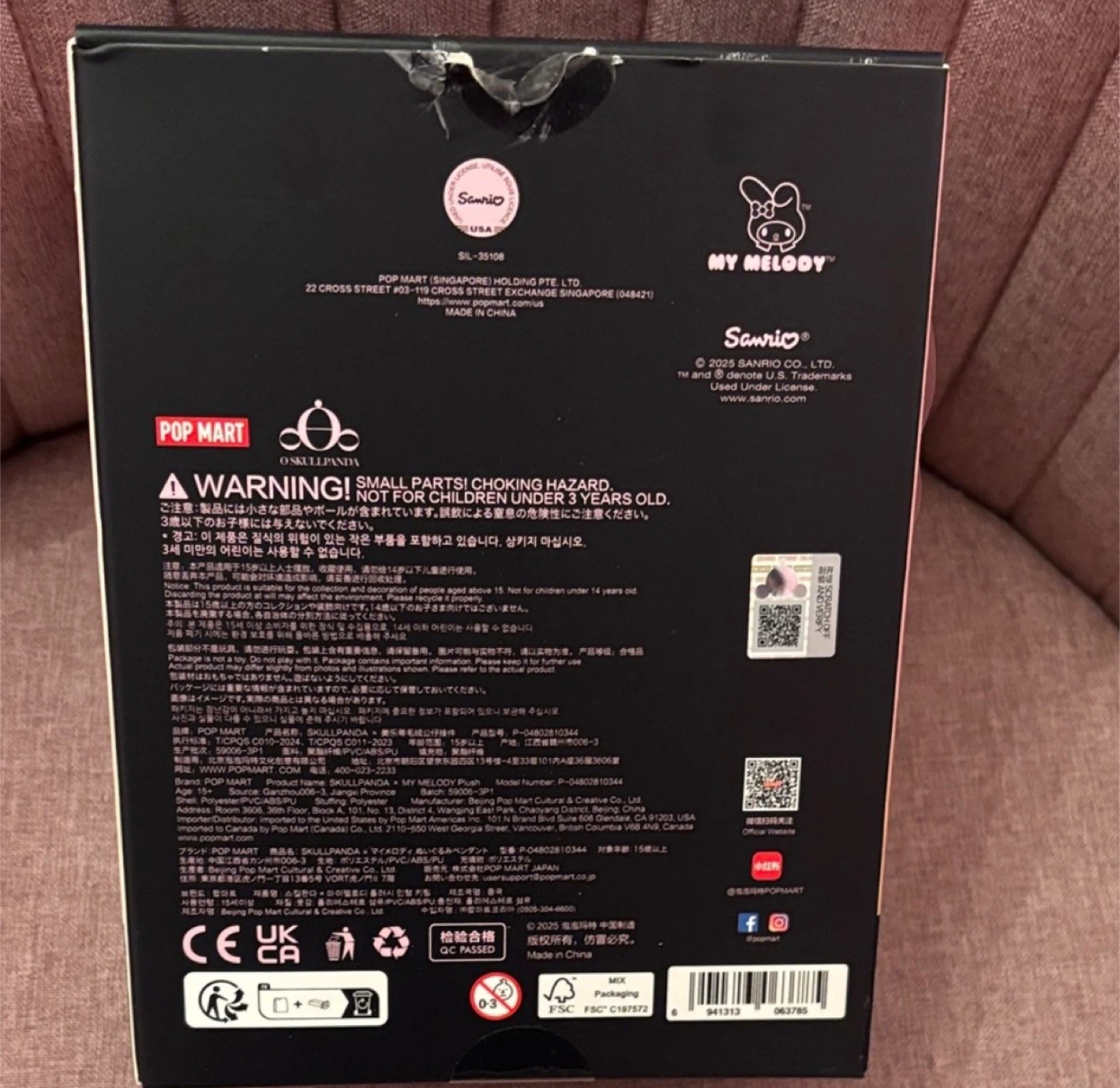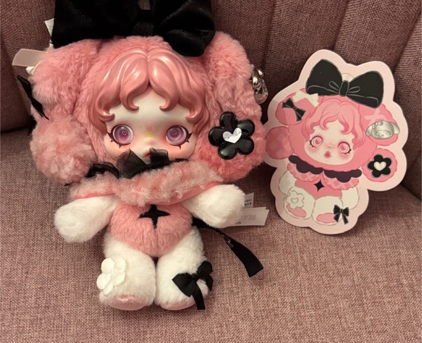 This POP MART Skullpanda My Melody plush is super cute and soft! It's made of polyester and features a fluffy pink design with black accents. It's a great collectible for any Sanrio fan!