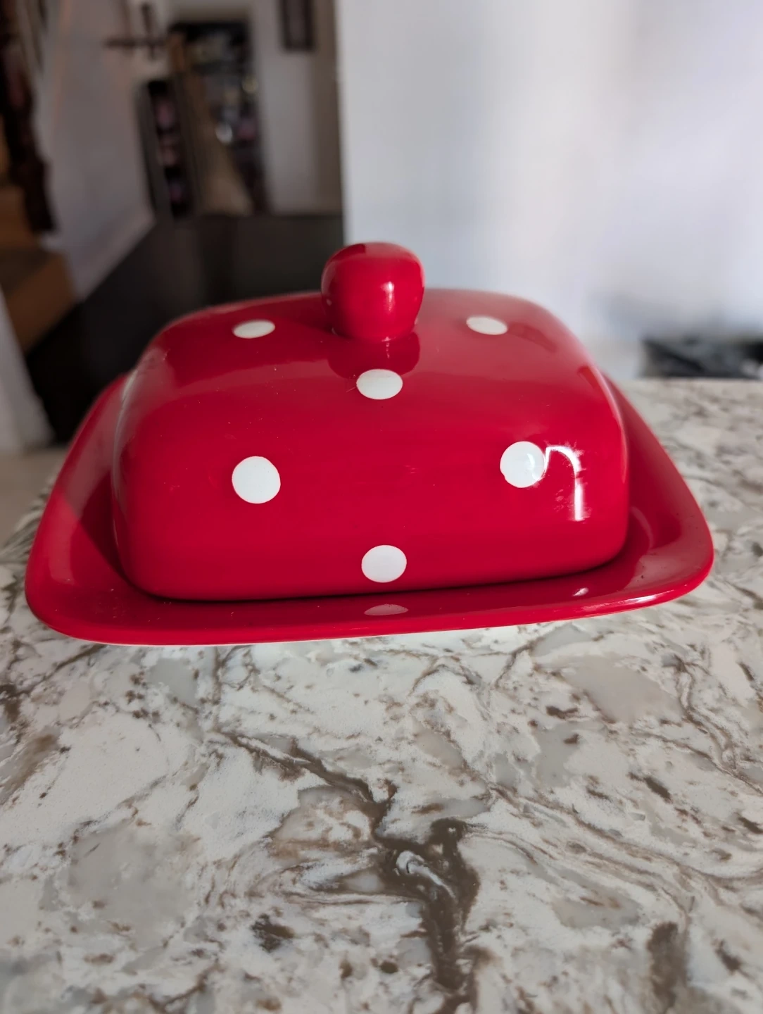 Ceramic butter dish with a red and white polka dot design. It's perfect for keeping butter fresh on the counter. Dishwasher safe.