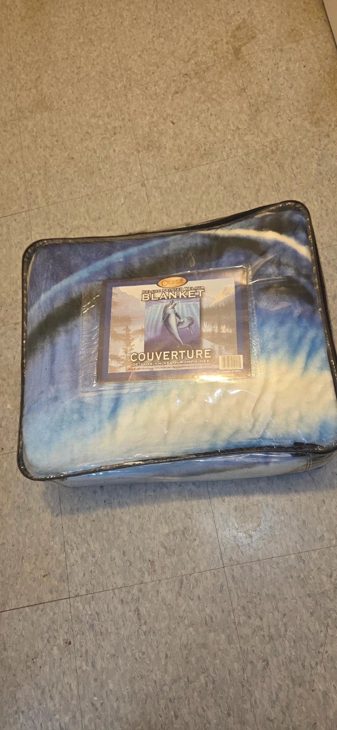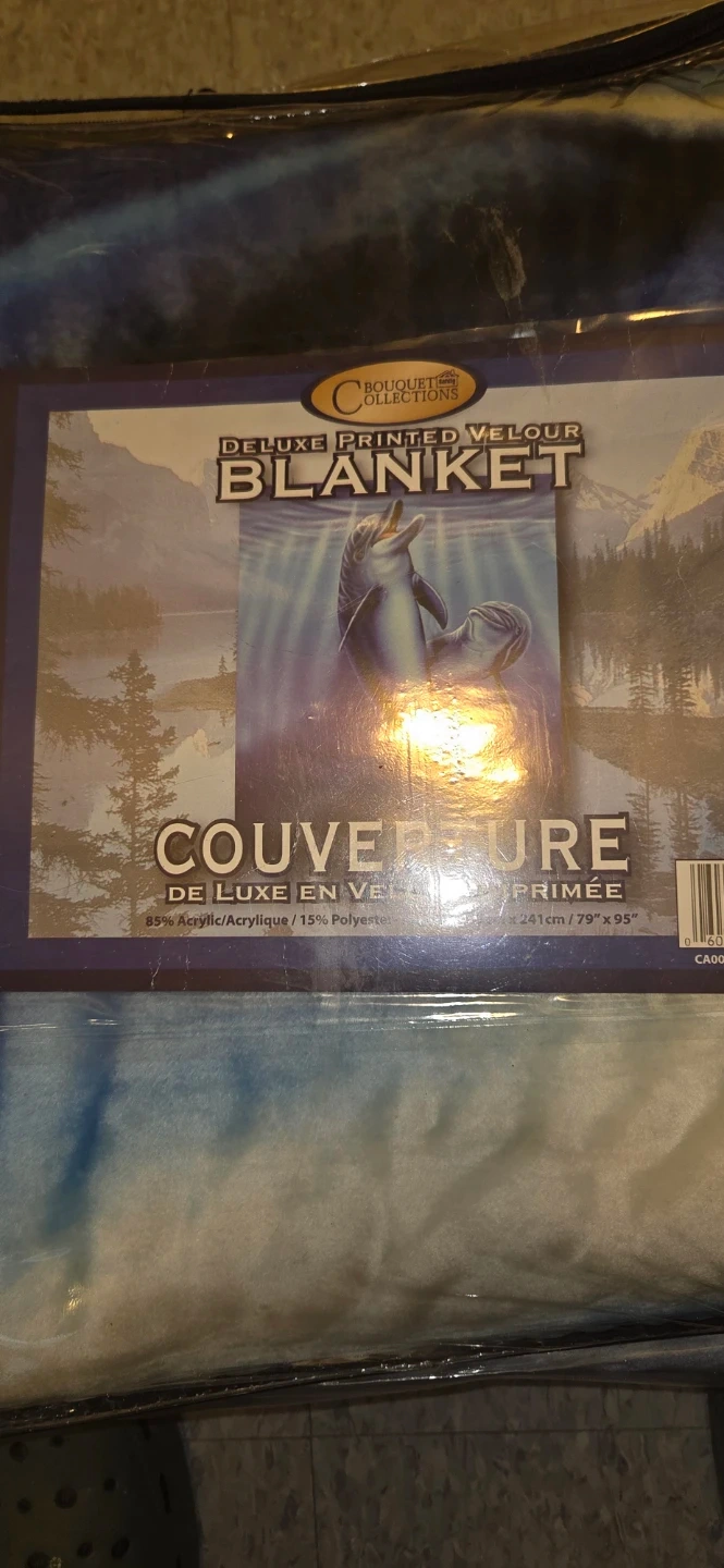 Selling for a friend-This is a deluxe printed velour blanket featuring a dolphin design. It measures 200 cm by 241cm and is made of 85% acrylic and 15% polyester. It comes in its original packaging.