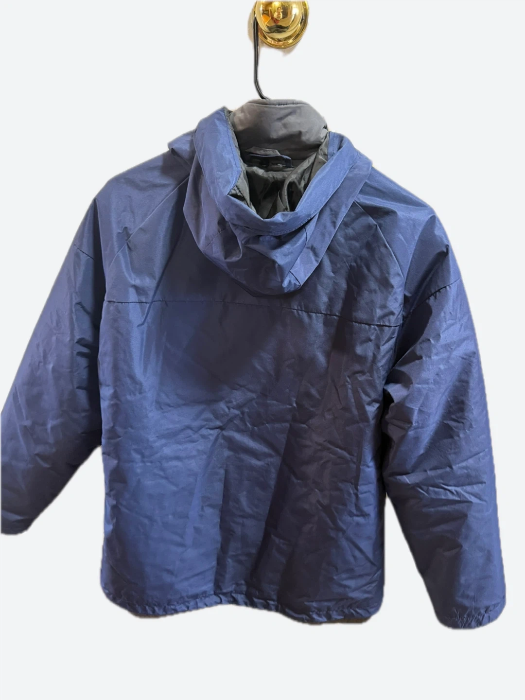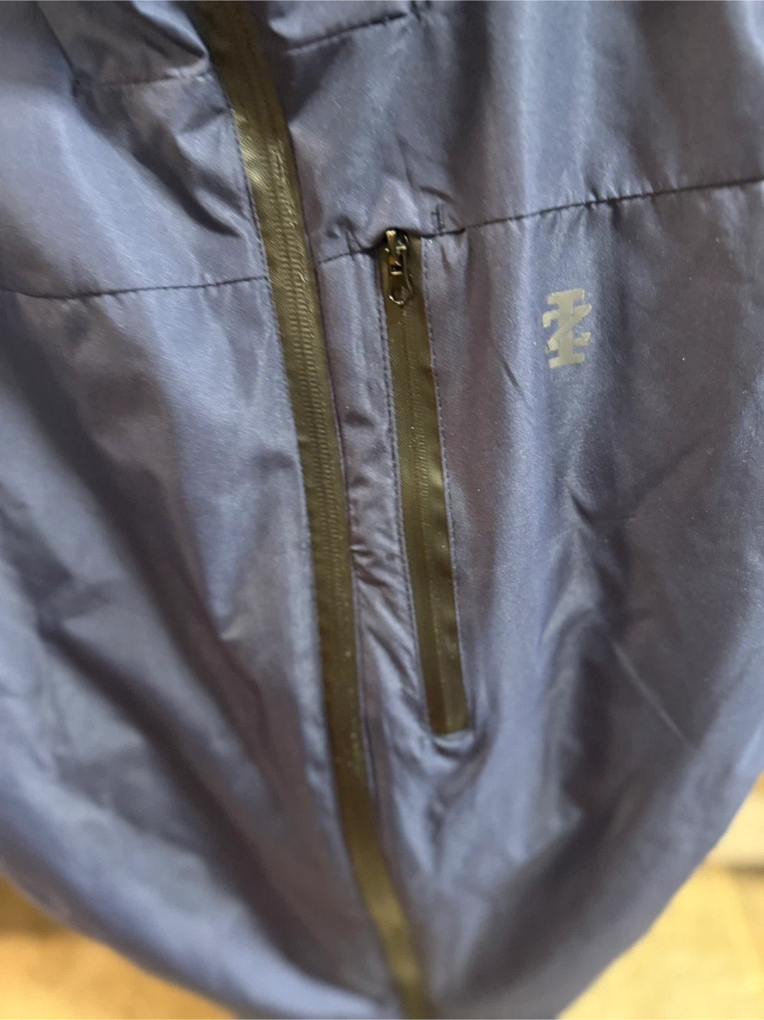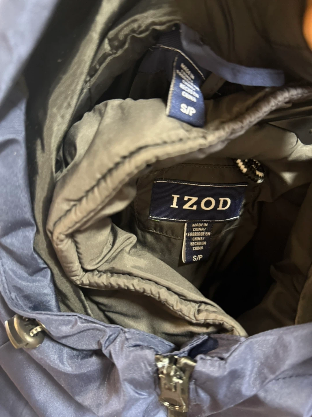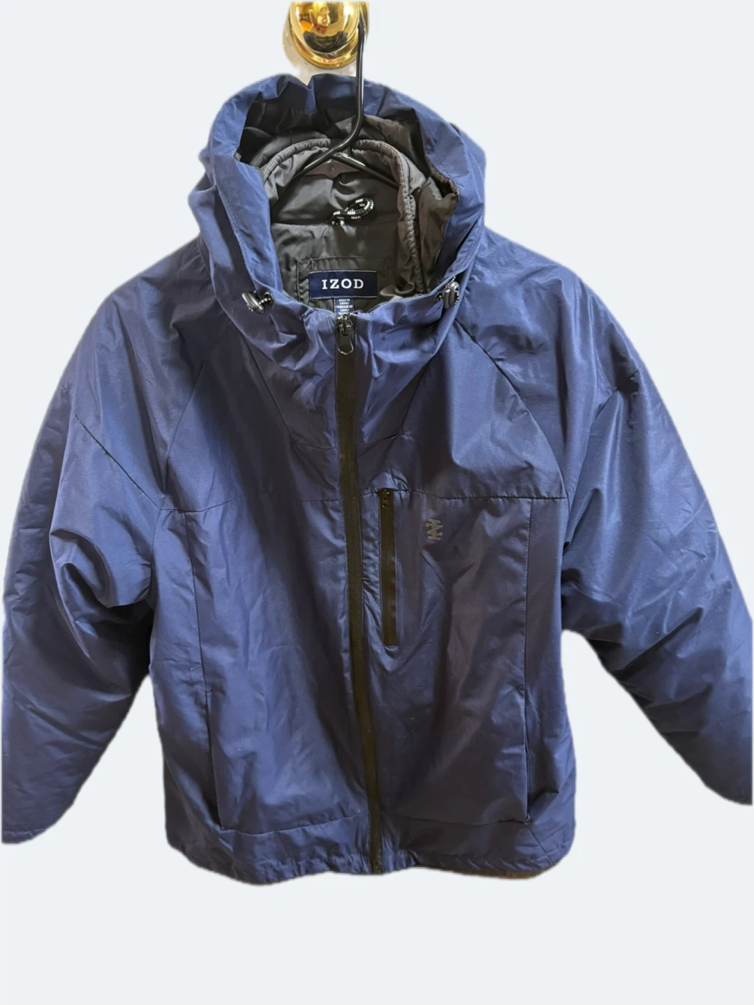 This is an IZOD hooded jacket in blue. It's a size S/P and made in China. It features a full zip front and a drawstring hood. (It has 2 jackets in 1 pack - (spring and winter and rain season