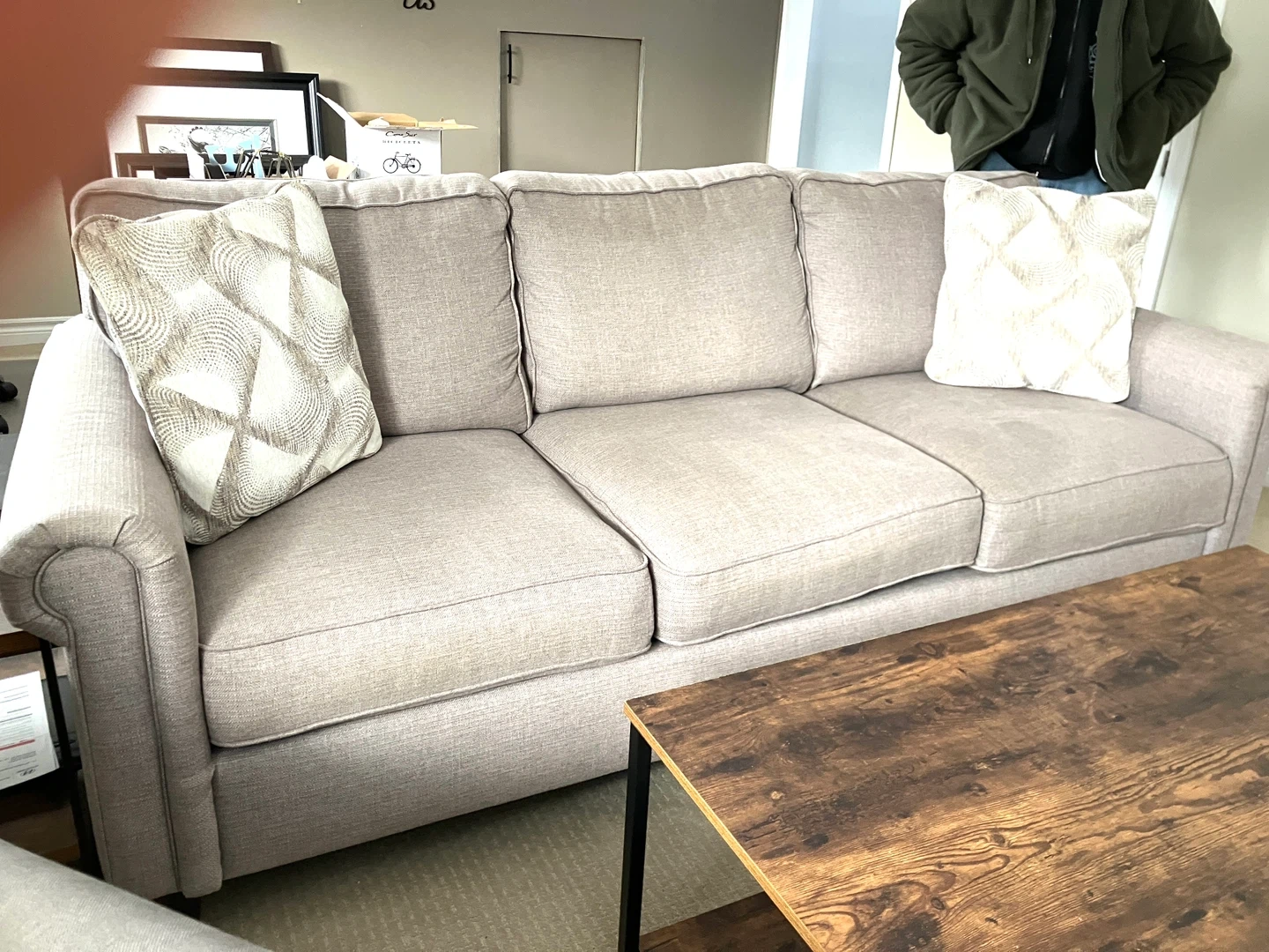 Owned for 3 years, scotchguarded, taken very good care was in rec room