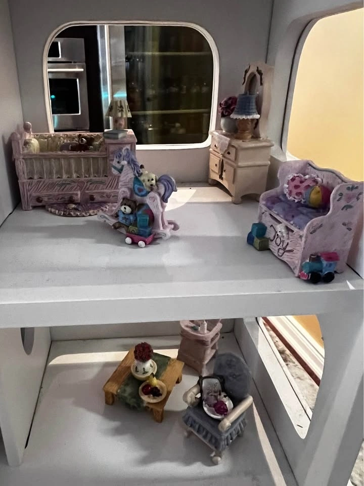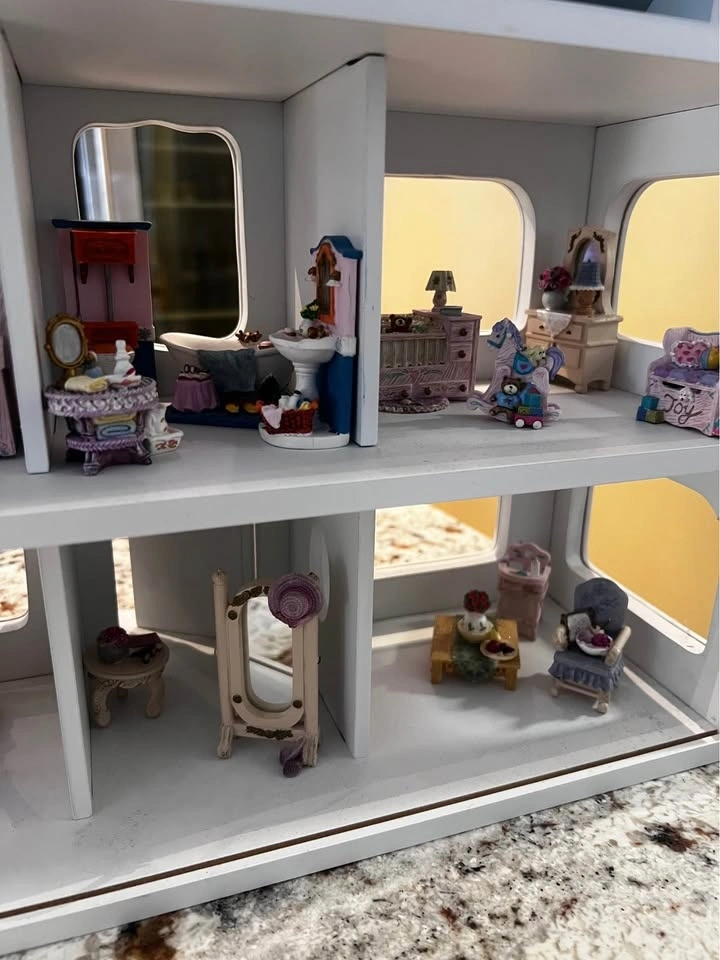 This is a very rare Vintage Avon Dollhouse, produced between 2000 and 2008. It comes with all 20 pieces of miniature furniture shown in the picture. The furniture pieces are made of solid resin, giving most of them a substantial weight, though some pieces are more delicate.