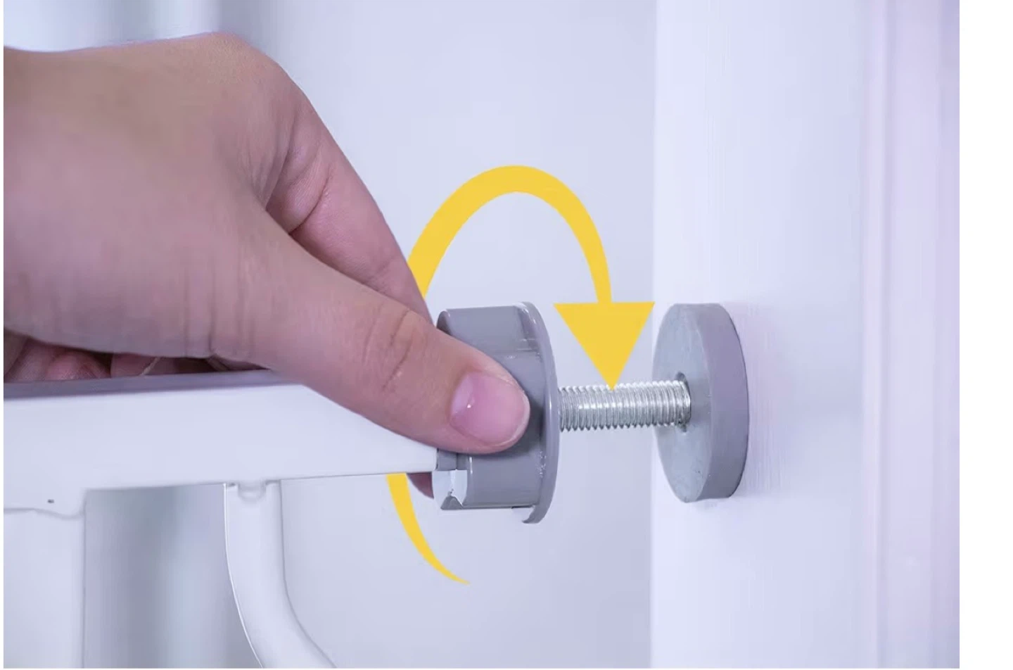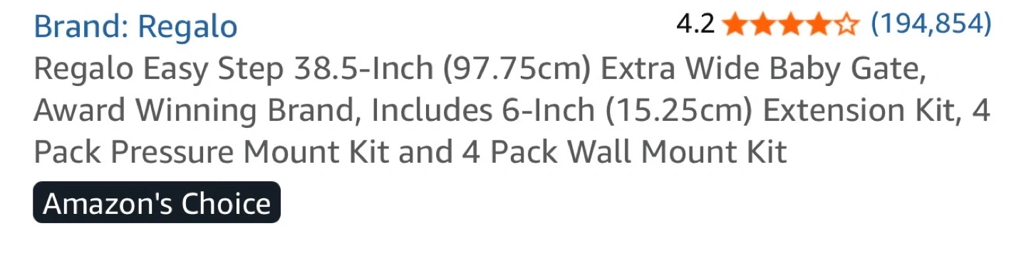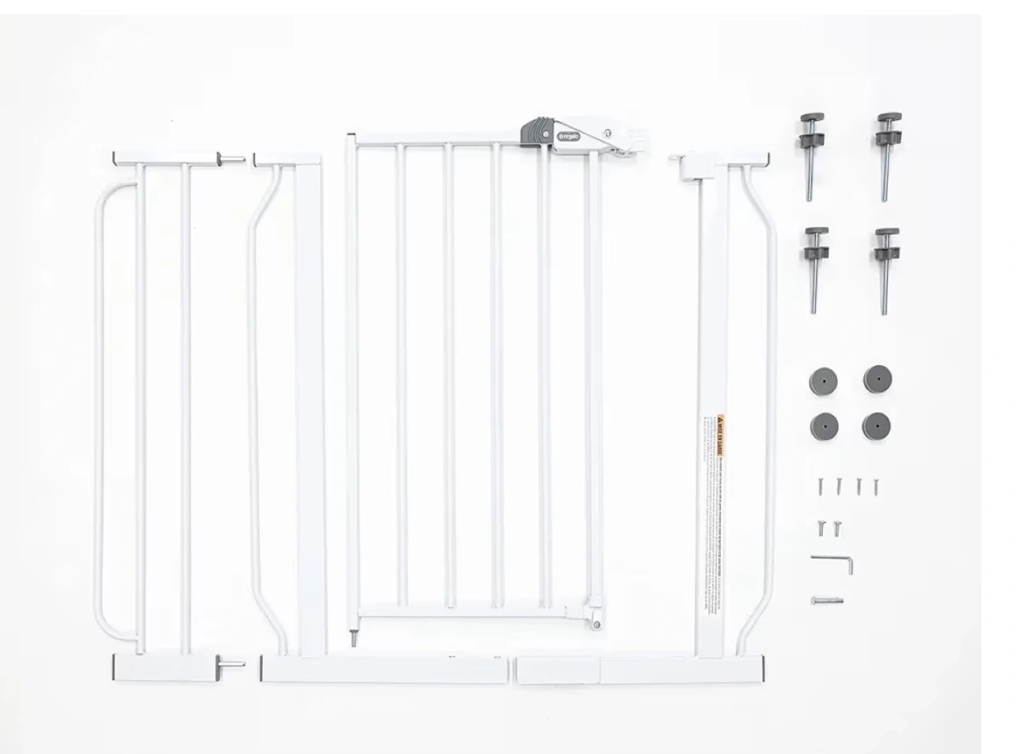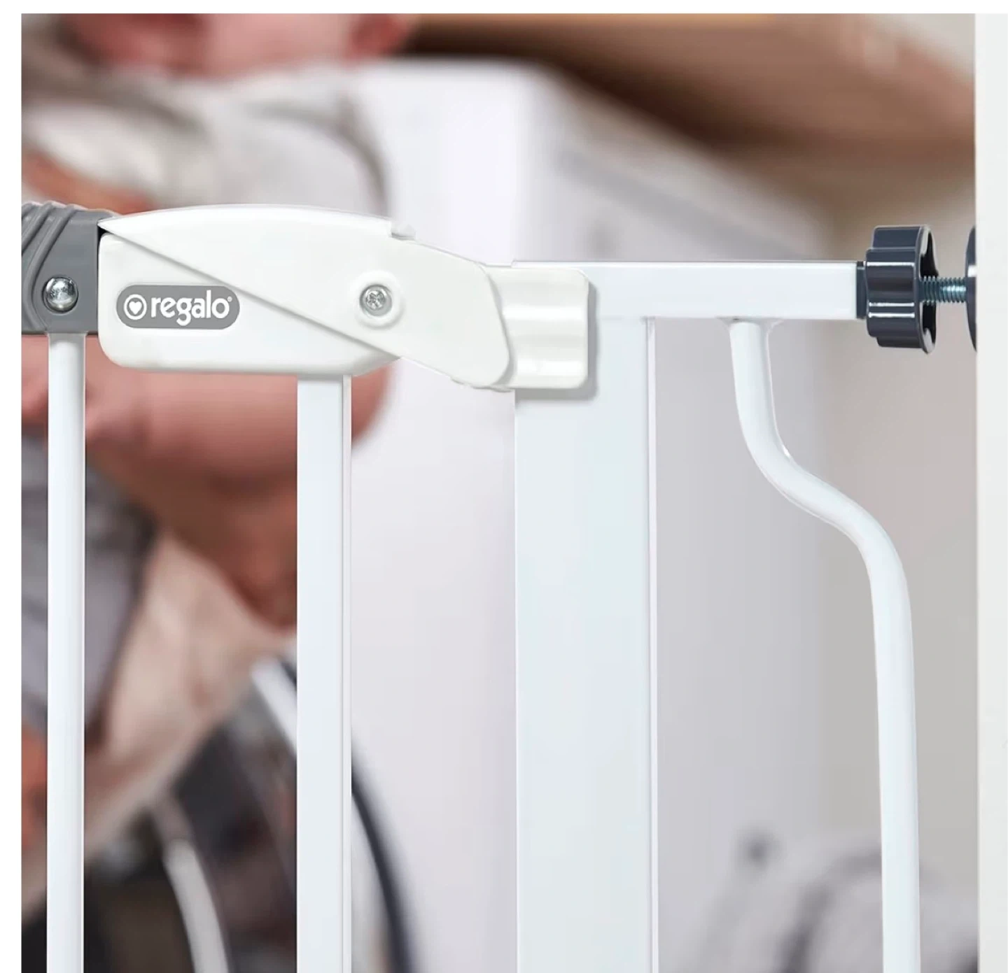 Pressure mounted baby gate by Regalo. It's white and includes all necessary hardware for installation. This gate's design is ideal for keeping little ones safe.