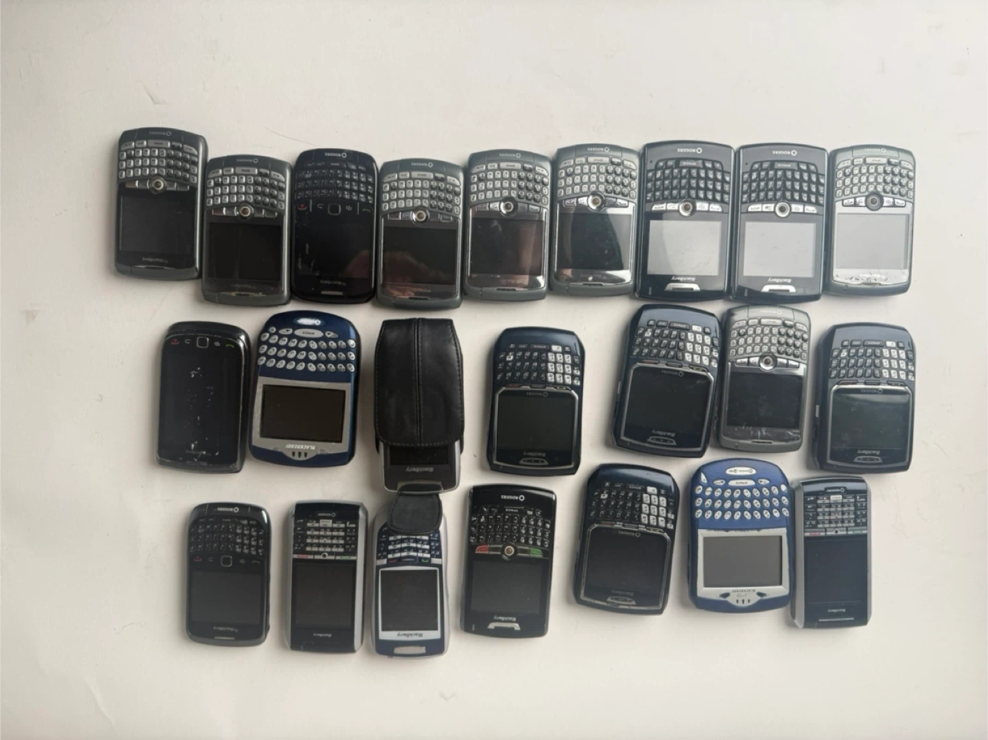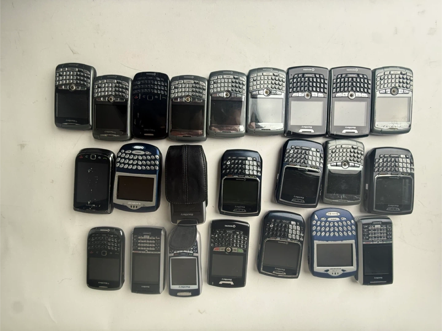A collection of BlackBerry mobile phones. Includes various models and colours. Some appear to be older models with full QWERTY keyboards. One phone comes with a leather case.