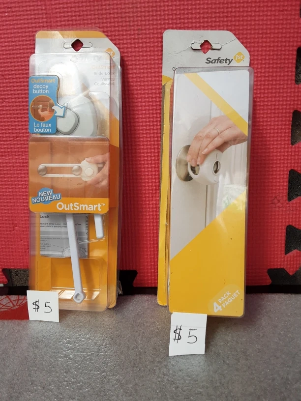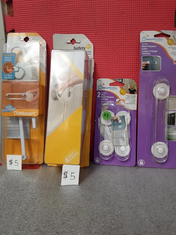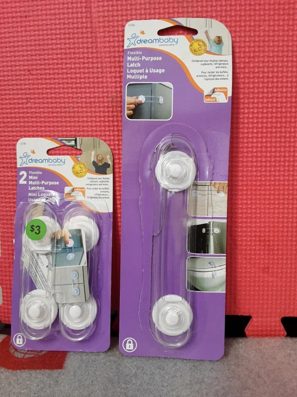 Child safety locks to help secure cabinets, drawers, and doors. Includes one Safety 1st OutSmart Slide Lock and two packs of Dreambaby flexible multi-purpose latches. These are great for keeping little ones safe around the house.