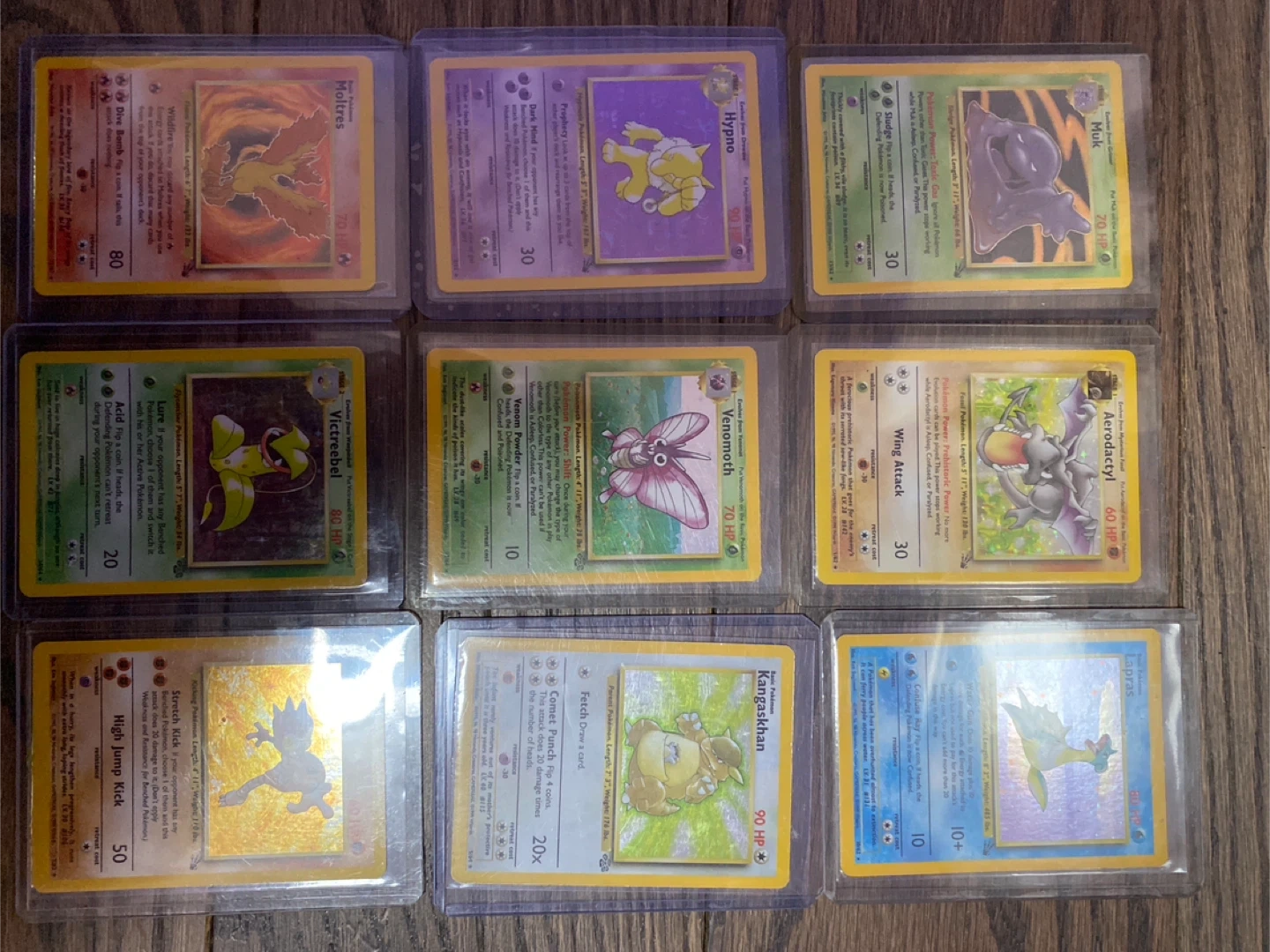 I Collection of vintage Pokemon cards including Moltres, Hypno, Muk, Victreebel, Venomoth, Aerodactyl, Kangaskhan, and Lapras. These cards feature classic artwork and game mechanics.