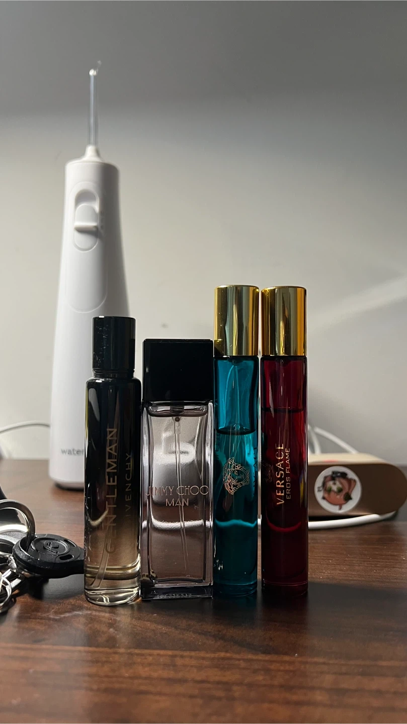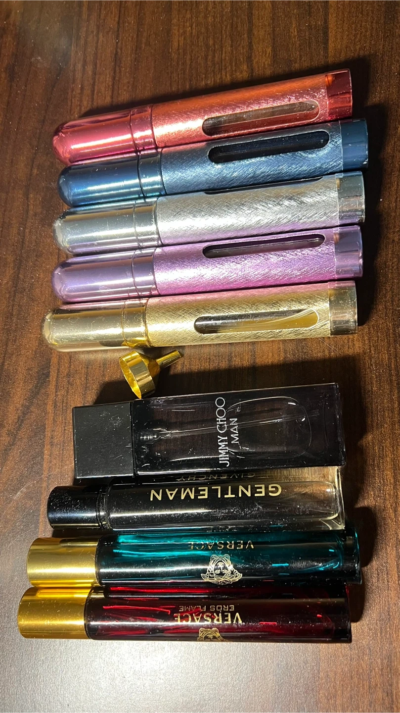 This lot includes a variety of refillable travel perfume atomizers in different colours, along with several designer fragrances. Brands include Jimmy Choo Man, Givenchy gentleman, Versace Eros and Versace Eros Flame. 4 bottles of semi-used/mostly full.